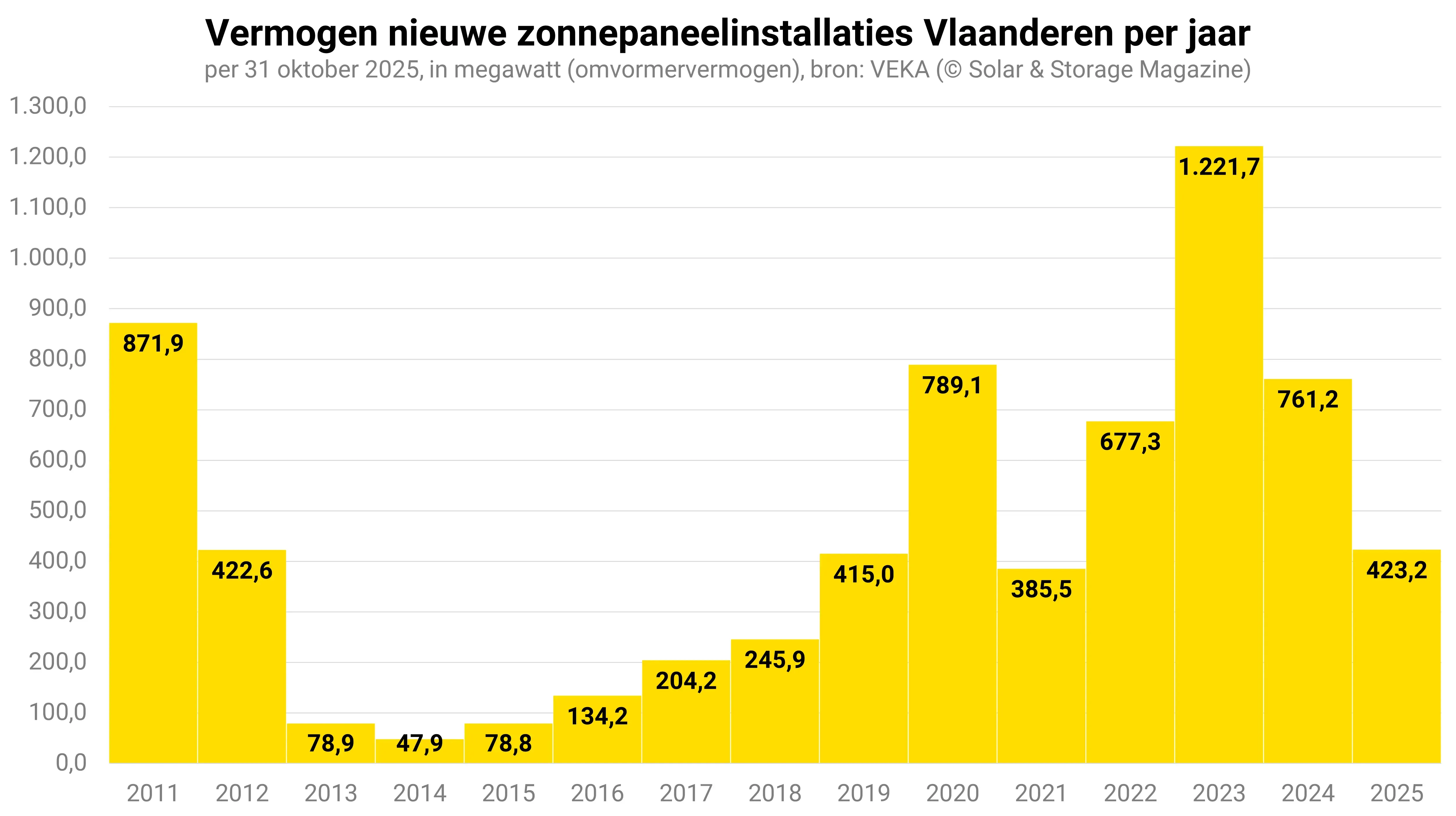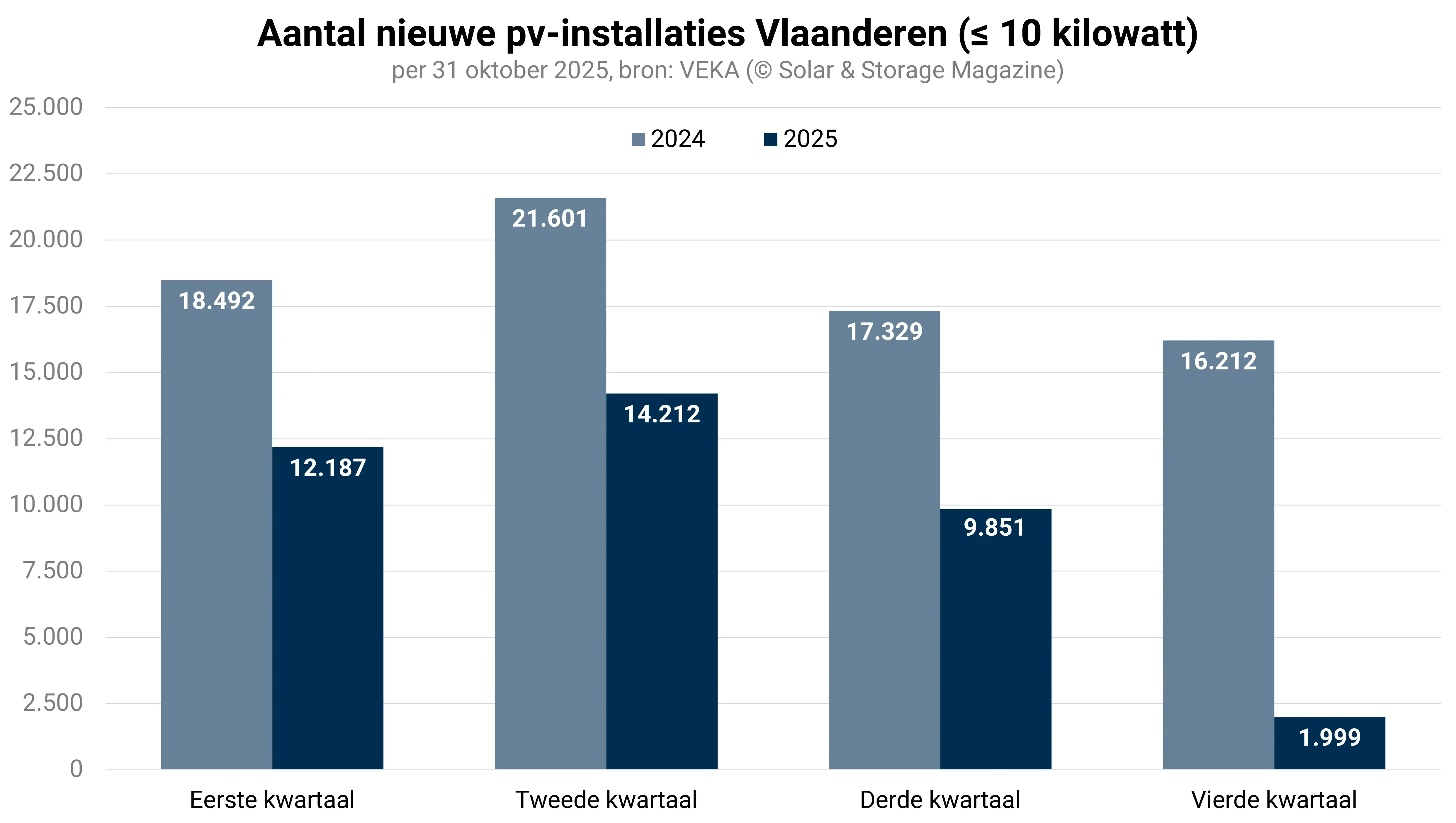 De nieuwste cijfers van het Vlaamse Energie- en Klimaatagentschap (VEKA) bevatten naast een correctie van de door consumenten in het eerst halfjaar van 2025 geïnstalleerde zonnepanelen ook de eerste cijfers voor het derde kwartaal van 2025.