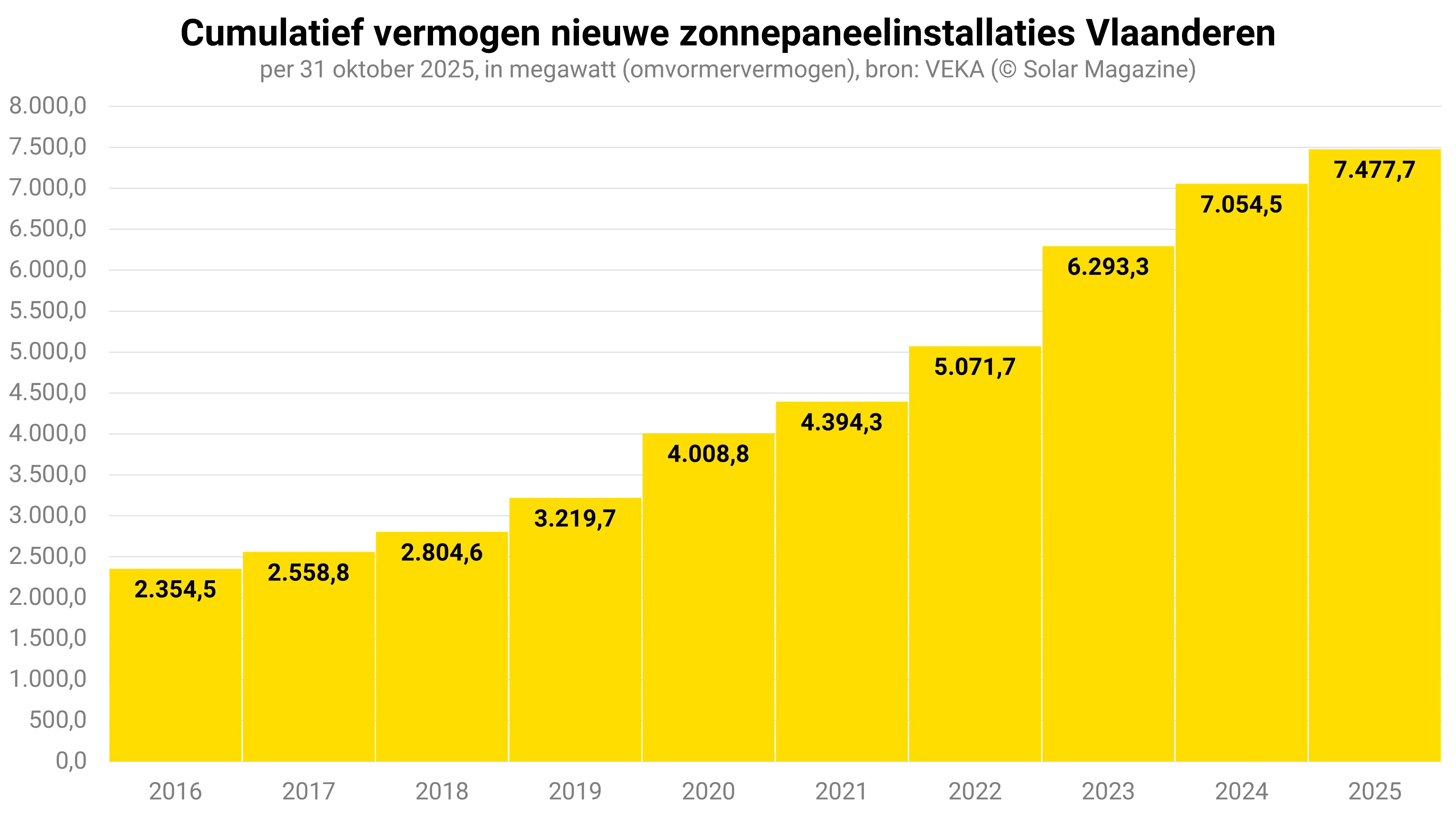 In totaal beschikte Vlaanderen volgens het VEKA per eind augustus over 7.477,7 megawatt aan pv-systemen. Daarbij gaat het om 1.059.834 zonnepaneelinstallaties.