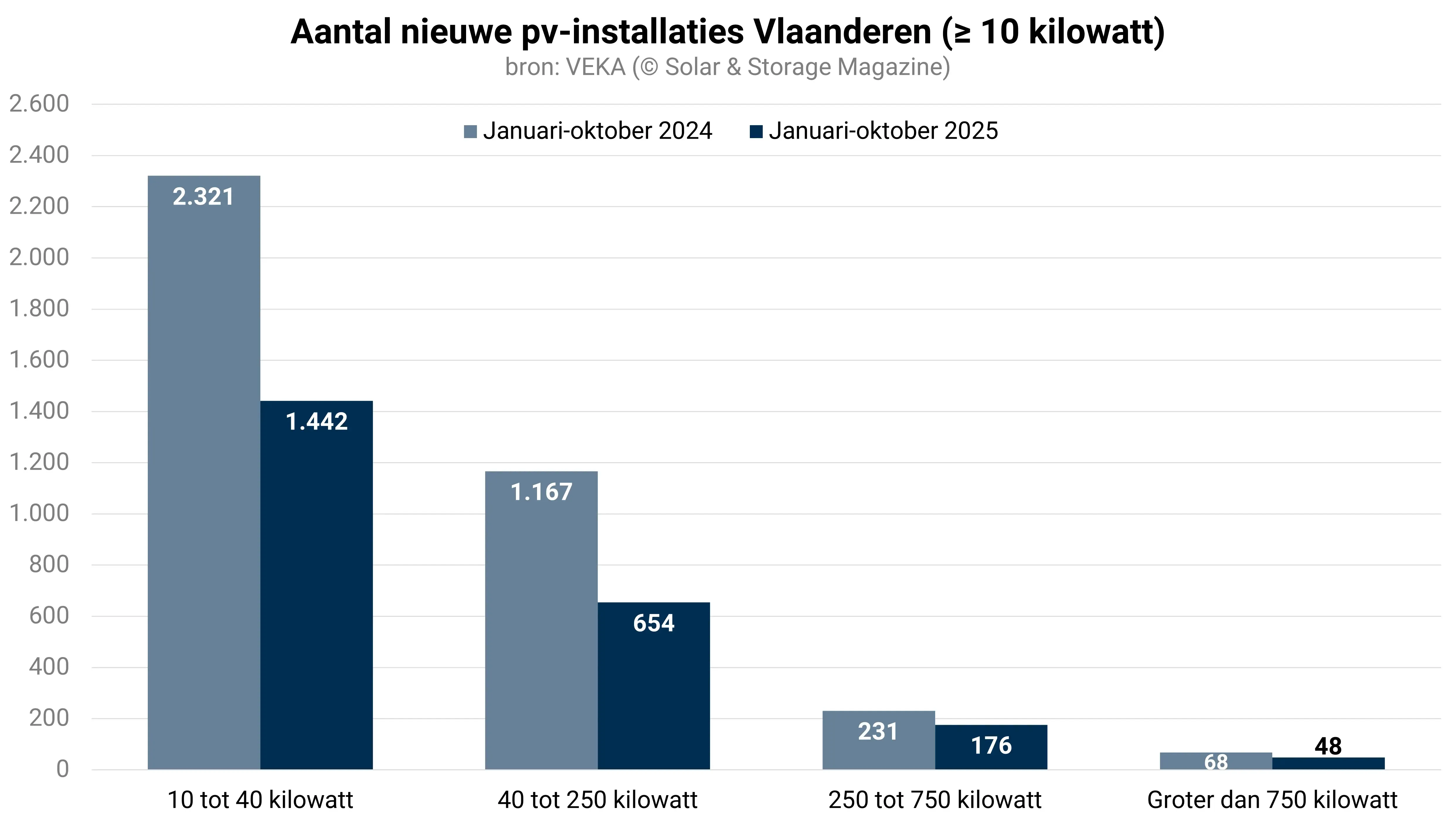 De onderstaande tabel bevat een vergelijking tussen het aantal nieuwe installaties voor de periode januari-oktober in 2024 en 2025 en laat zien dat dit in de voorlopige cijfers met 40 procent is gedaald. Daarbij moet natuurlijk opgemerkt worden dat de cijfers voor het kalenderjaar 2025 in de komende maanden nog naar boven bijgesteld zullen worden.
