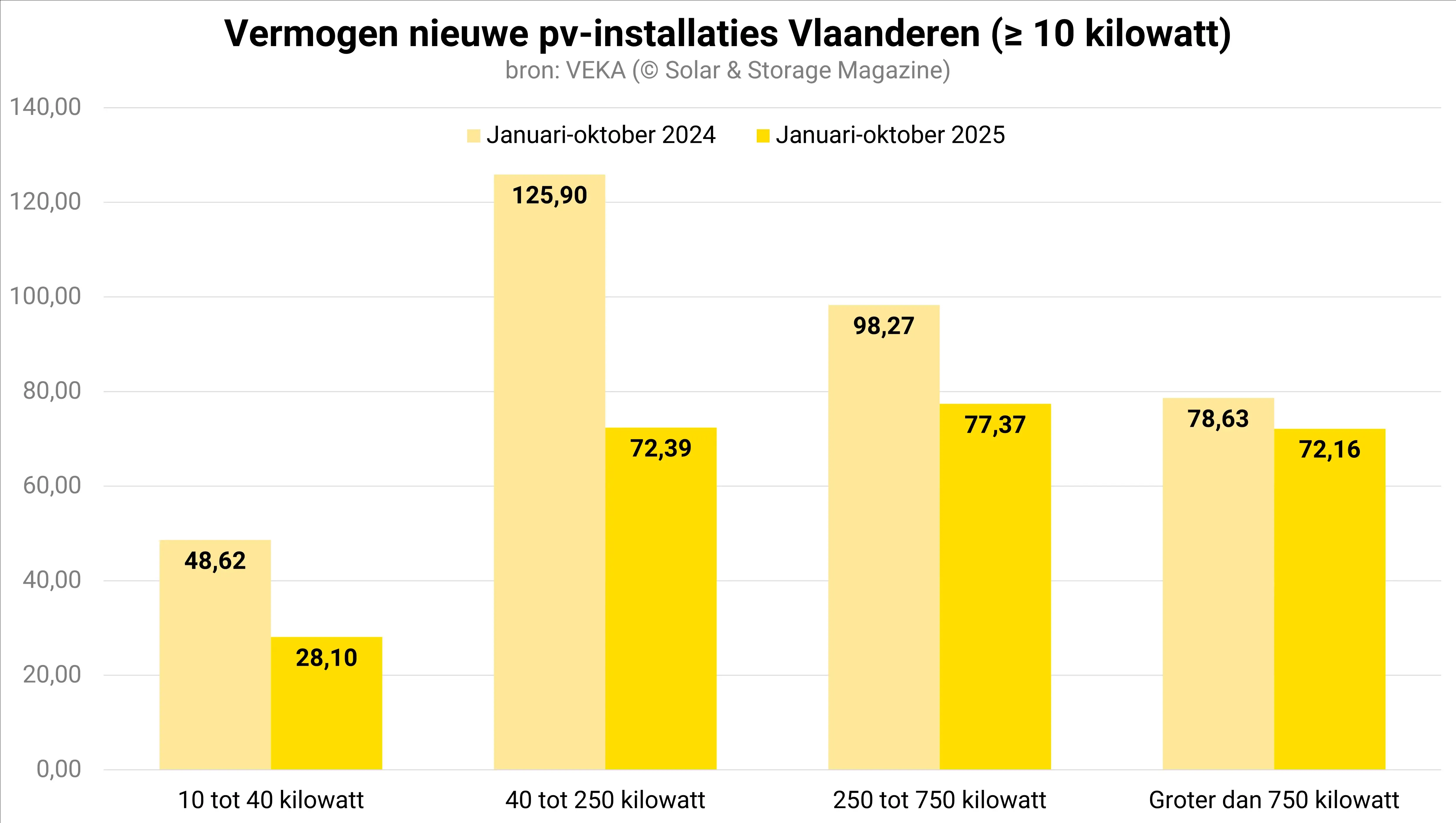 De onderstaande tabel bevat een vergelijking tussen het vermogen van de nieuwe installaties voor de kalenderjaren 2024 en 2025 en laat zien dat dit met 33 procent is gedaald, maar de achterstand is daarbij opnieuw verkleind ten opzichte van de eerdere update die de installatiecijfers tot en met de maand augustus bevatte. De zakelijke markt is net als vorig jaar de kartrekker. De verkopen in de zakelijke markt zullen de komende maanden nog groter blijken, omdat veel zakelijke installaties door het verwerkingsproces pas enkele maanden na inbedrijfstelling – met terugwerkende kracht – in de statistieken terug te zien zijn.