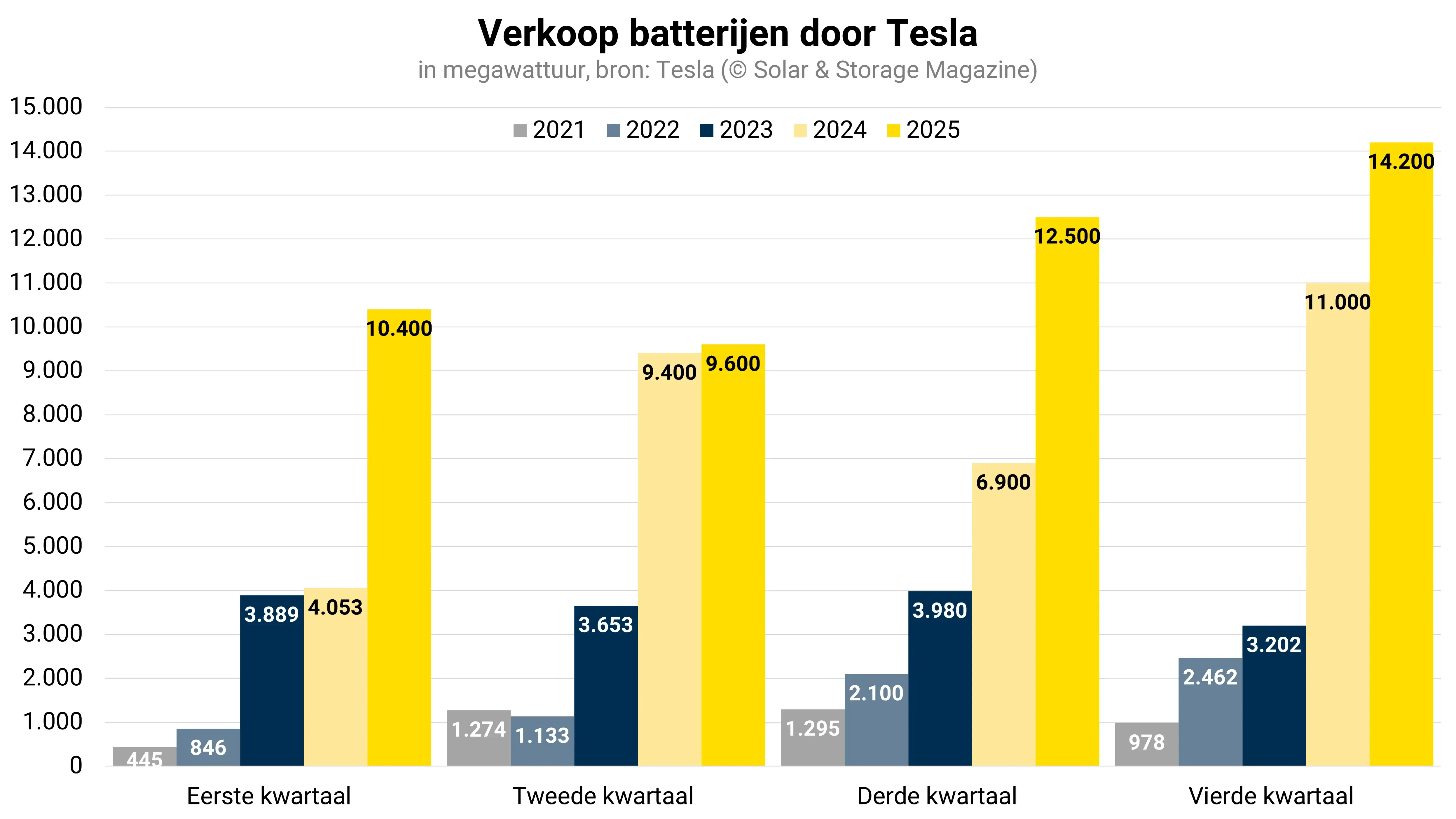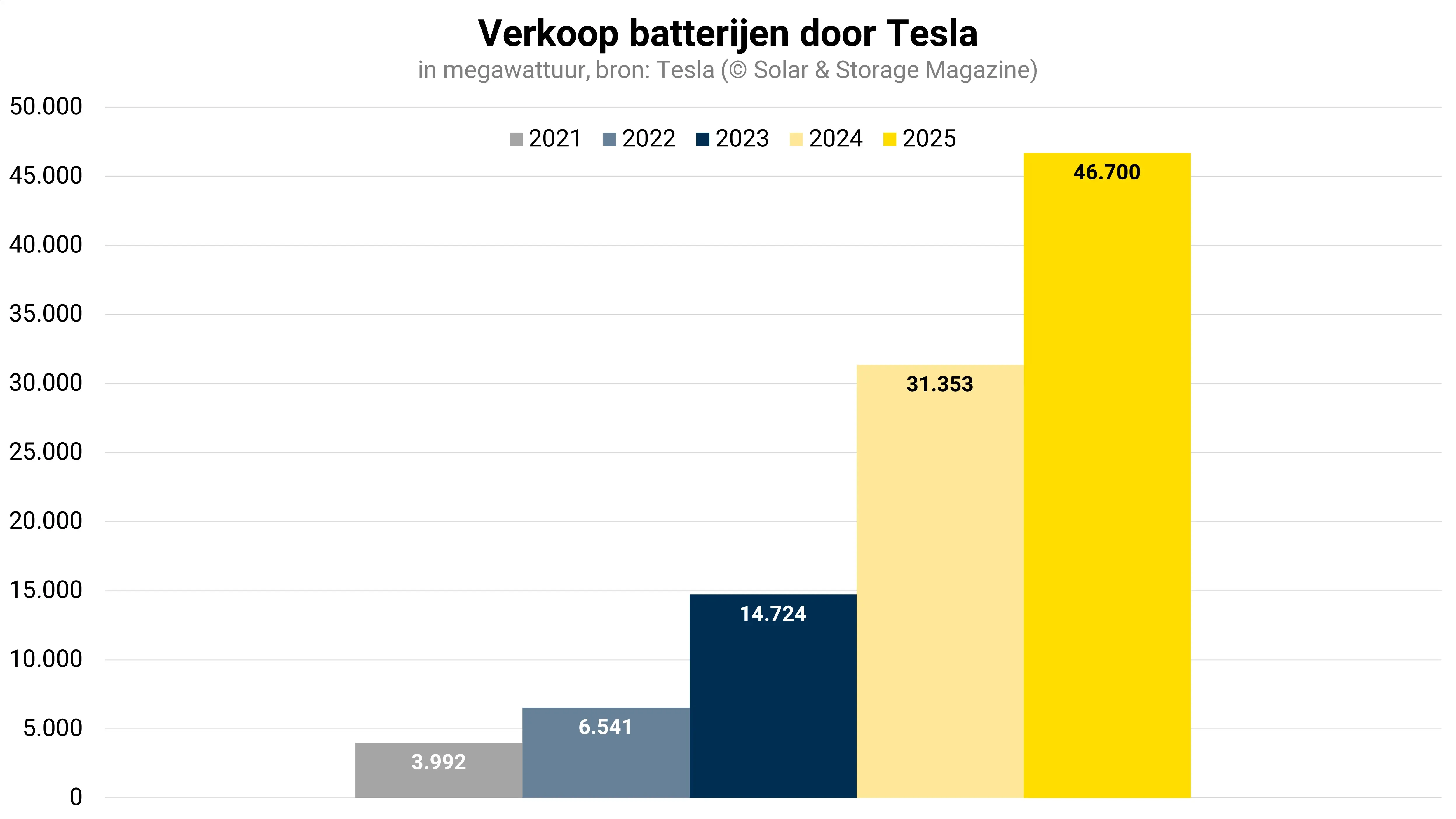 Voor het hele jaar 2025 kwam de totale uitrol van energieopslag uit op 46,7 gigawattuur. Dit betekent een groei van 49 procent ten opzichte van de 31,4 gigawattuur die Tesla in 2024 uitleverde.