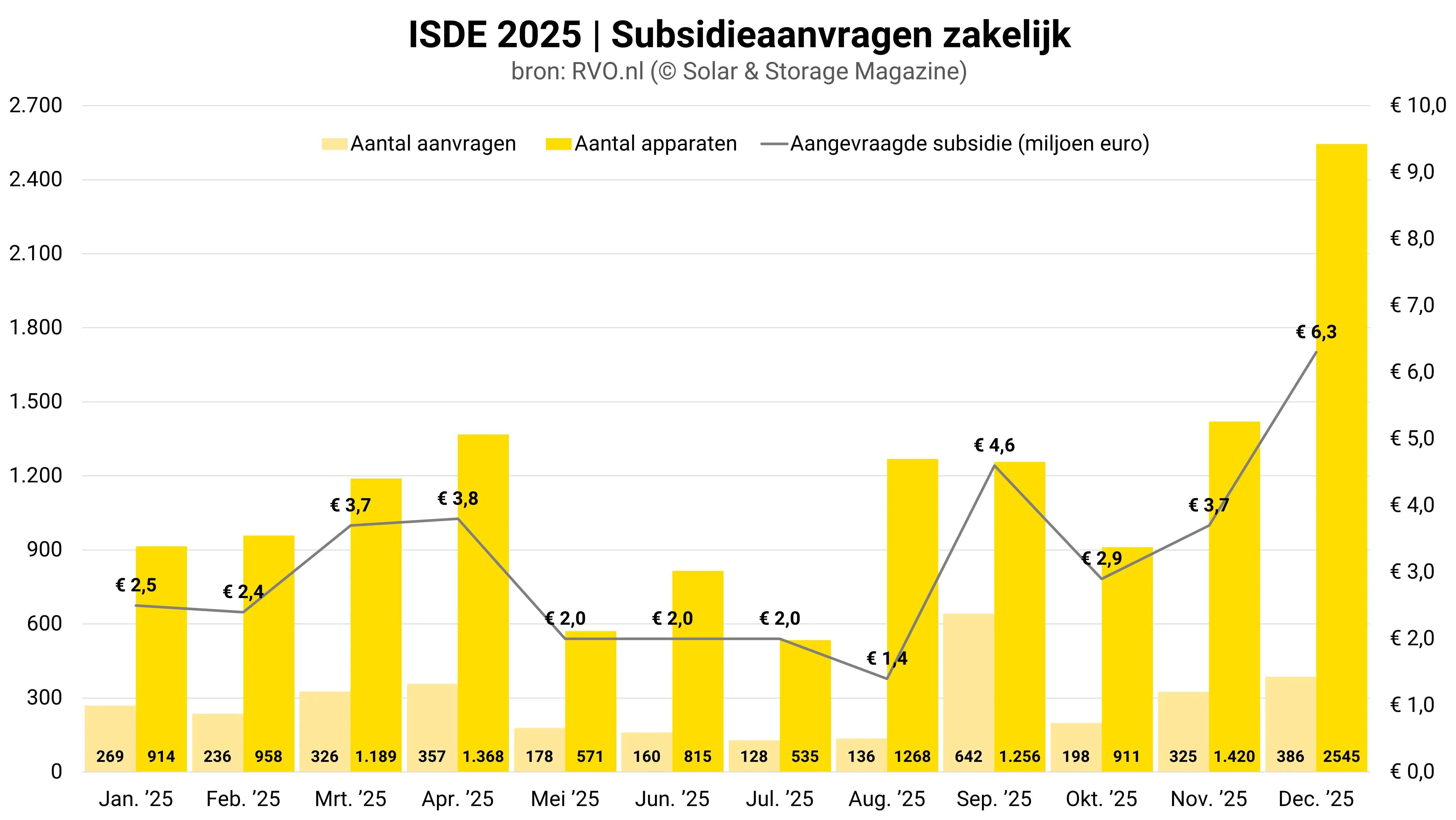 De maand december was ook voor de zakelijke markt een zeer goede maand met 386 subsidieaanvragen voor 2.545 apparaten, beiden het hoogste niveau van dit kalenderjaar. Gemiddeld werden in 2025 maandelijks 278 aanvragen ingediend voor 1.146 apparaten en een subsidiebedrag van 3,1 miljoen euro.