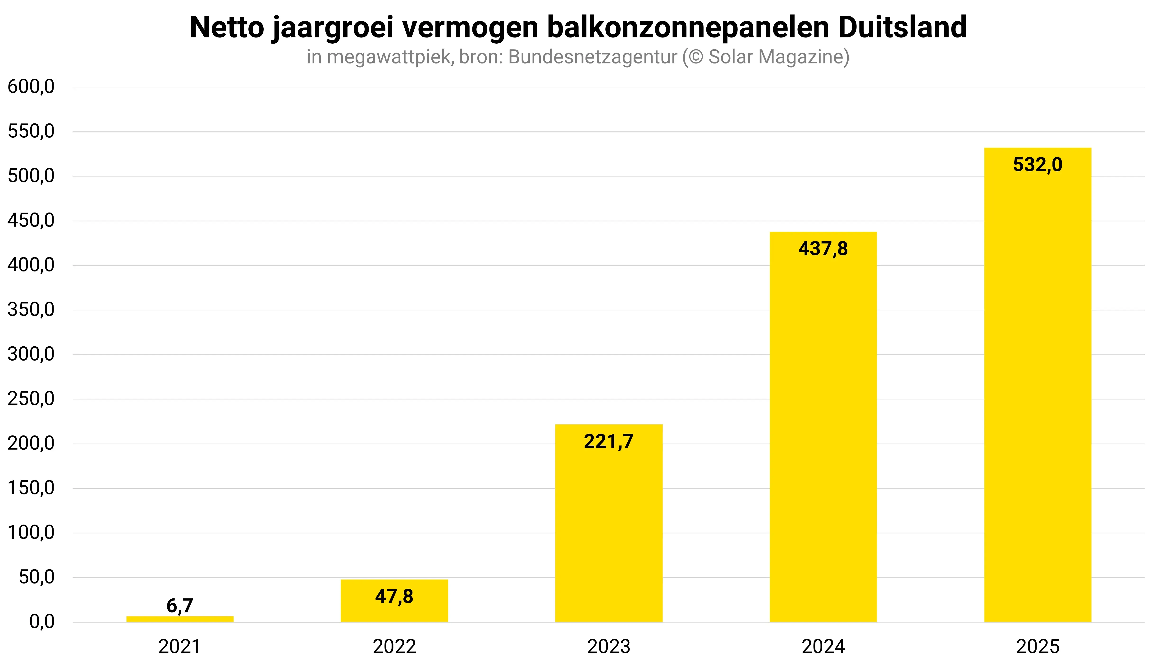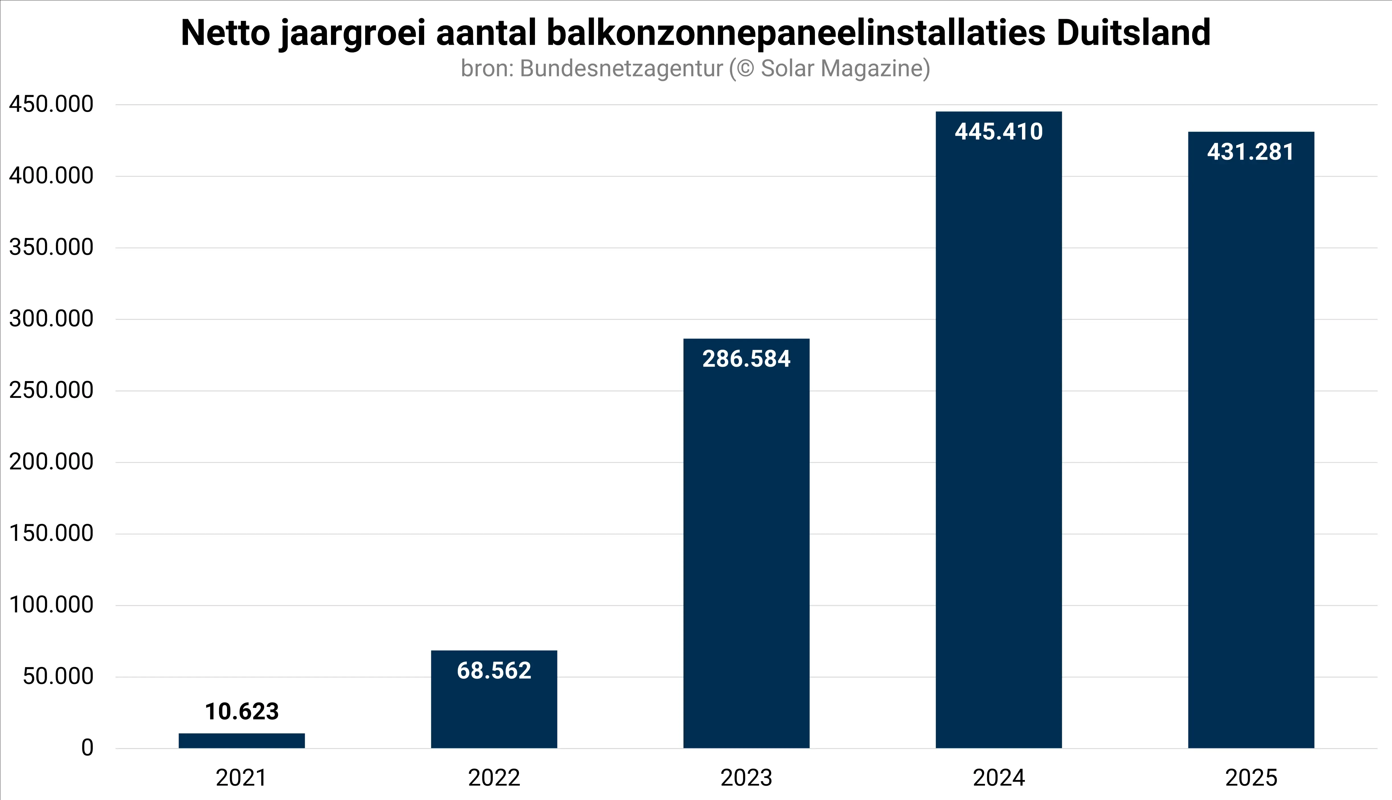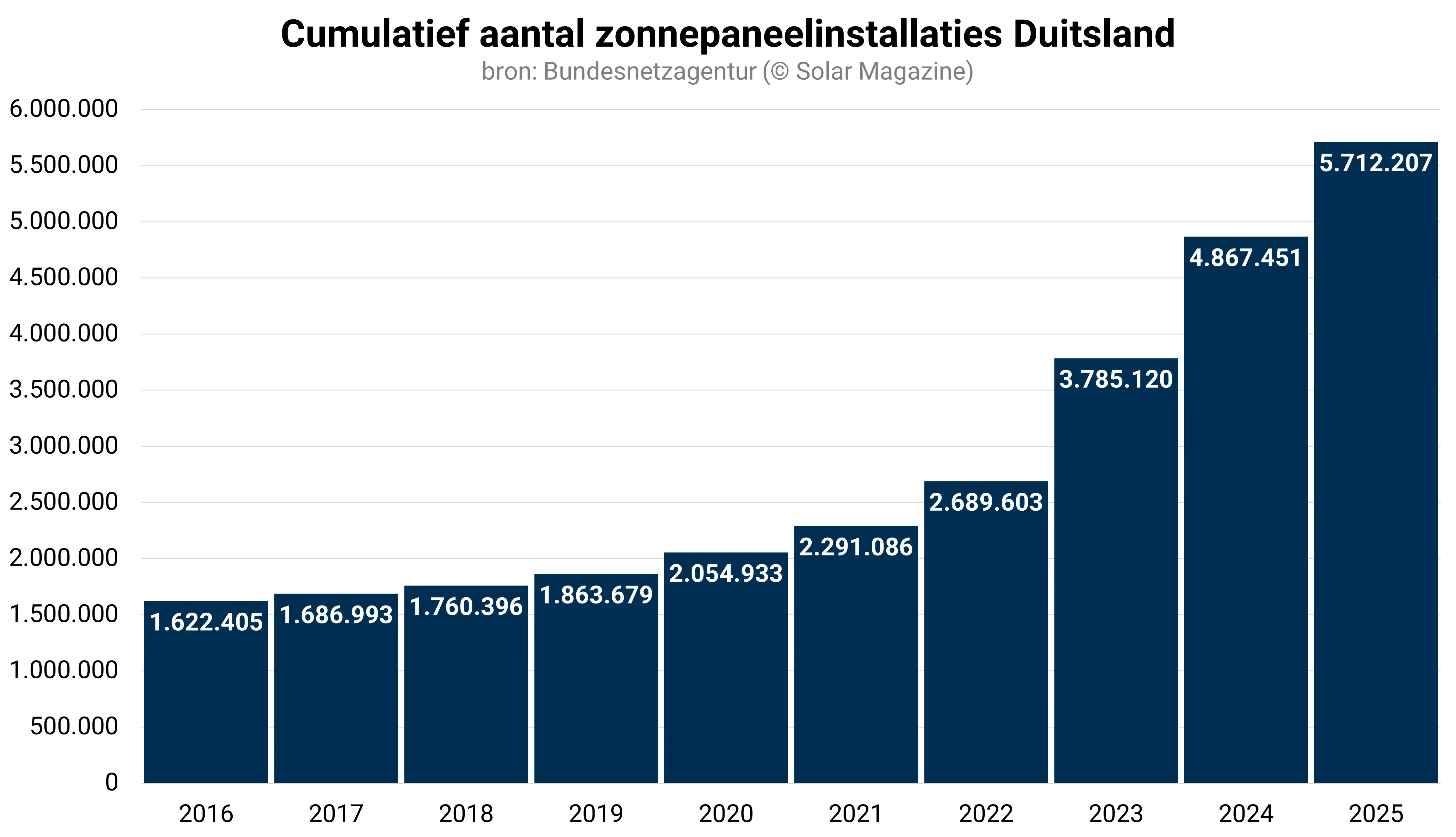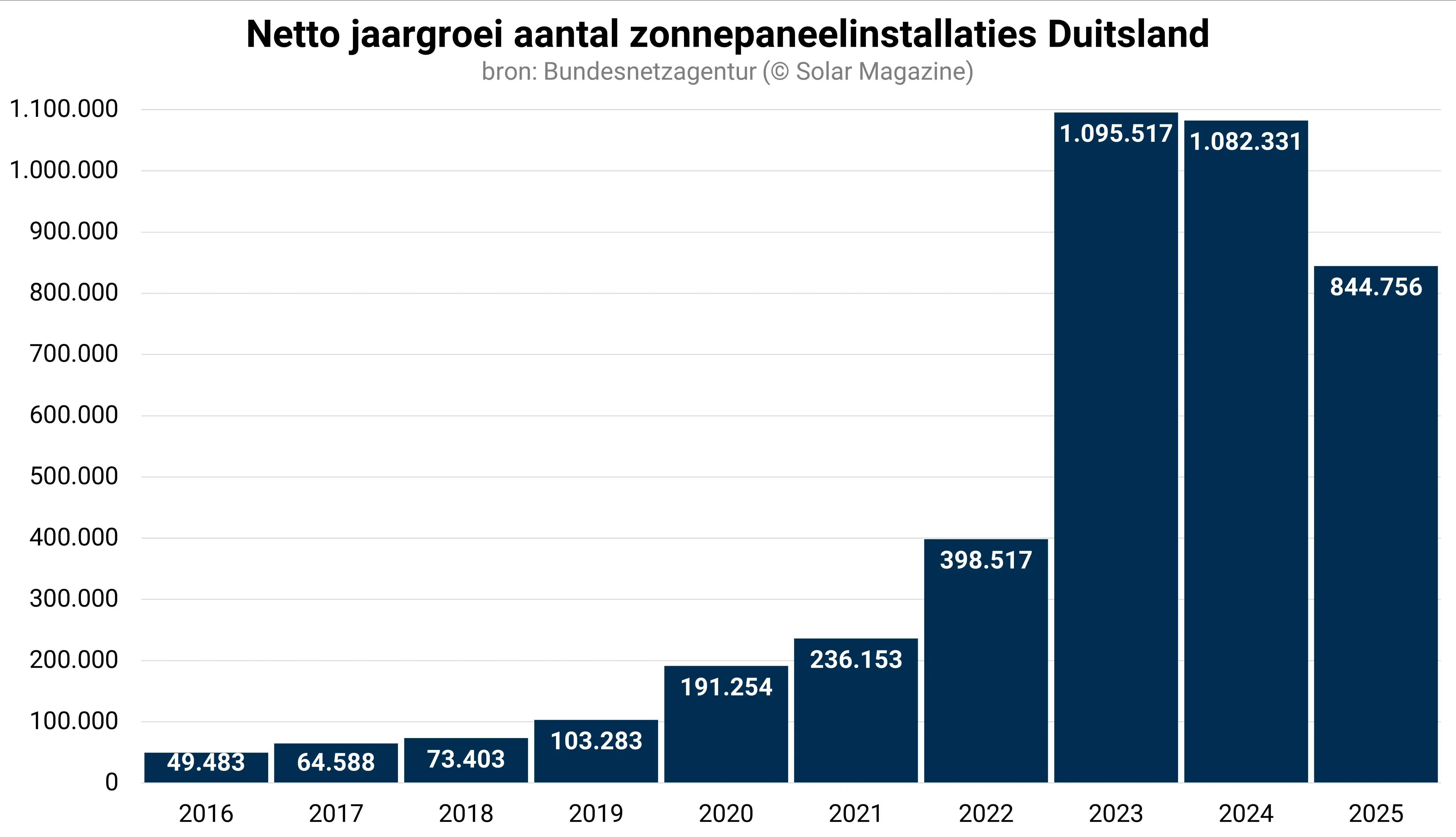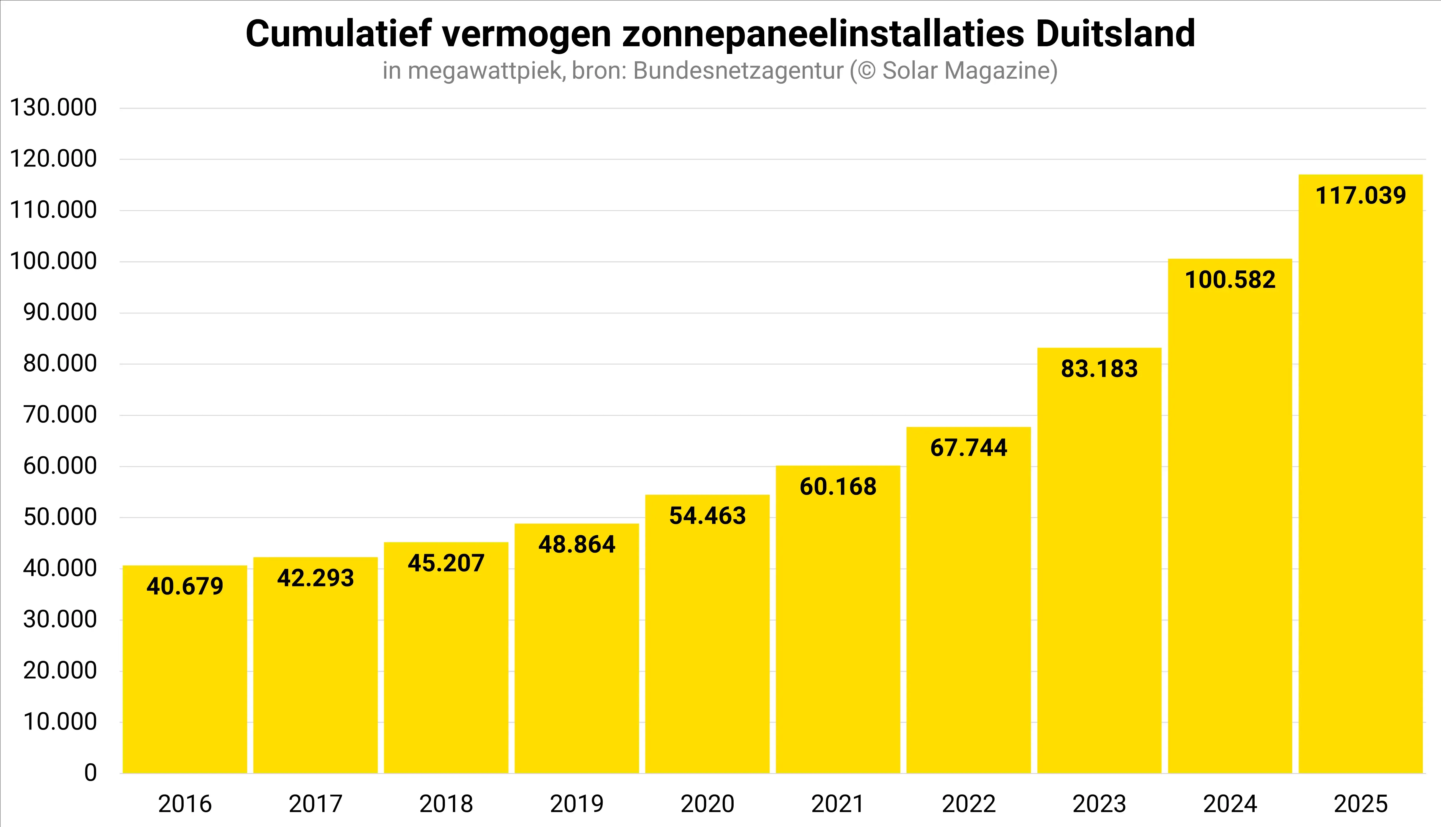 In totaal telt Duitsland inmiddels ruim 5,7 miljoen pv-installaties met een vermogen van ruim 117 gigawattpiek. Duitsland is nog altijd het enige Europese land met meer dan 100 gigawattpiek geïnstalleerd zonnepaneelvermogen.