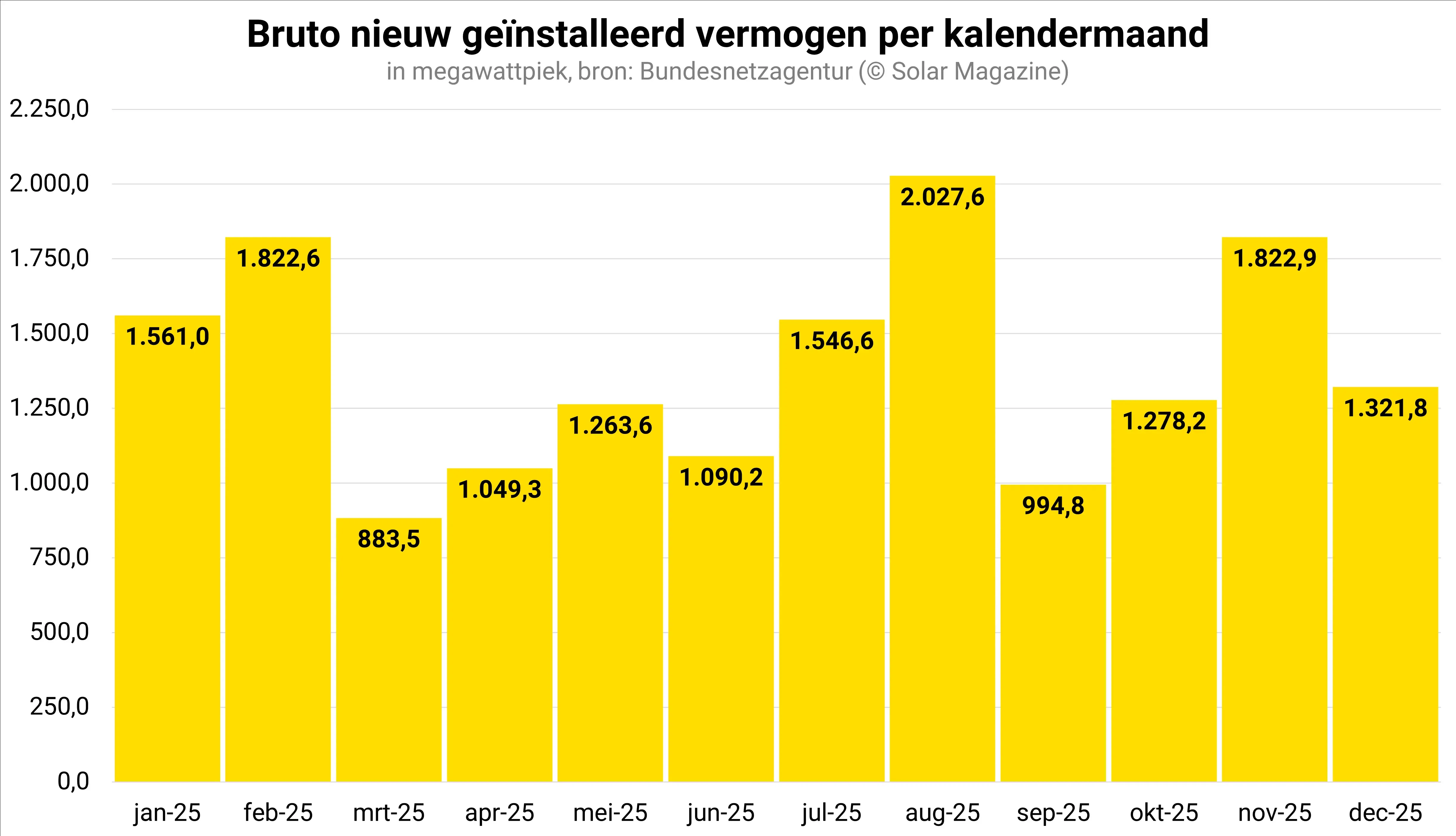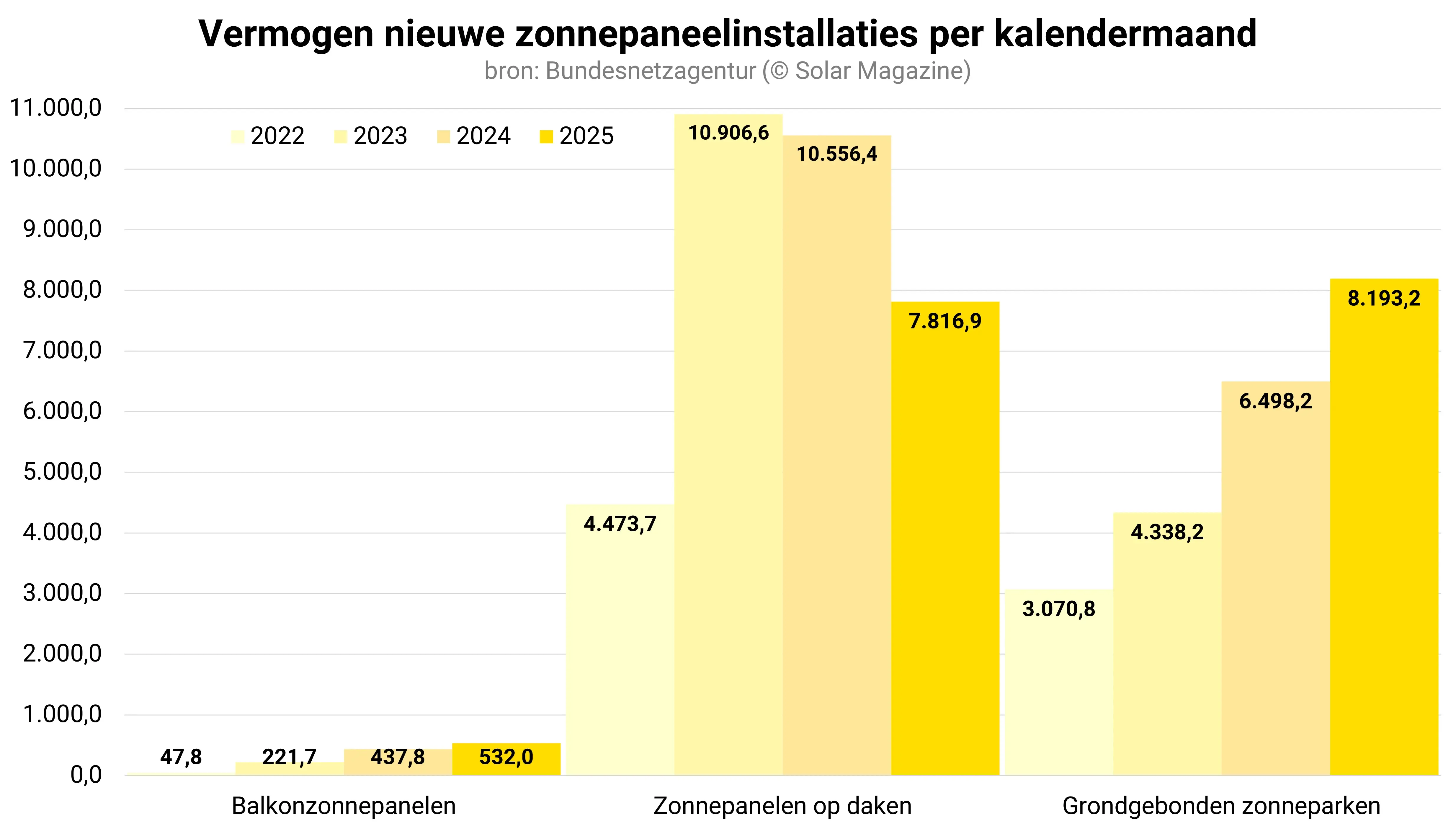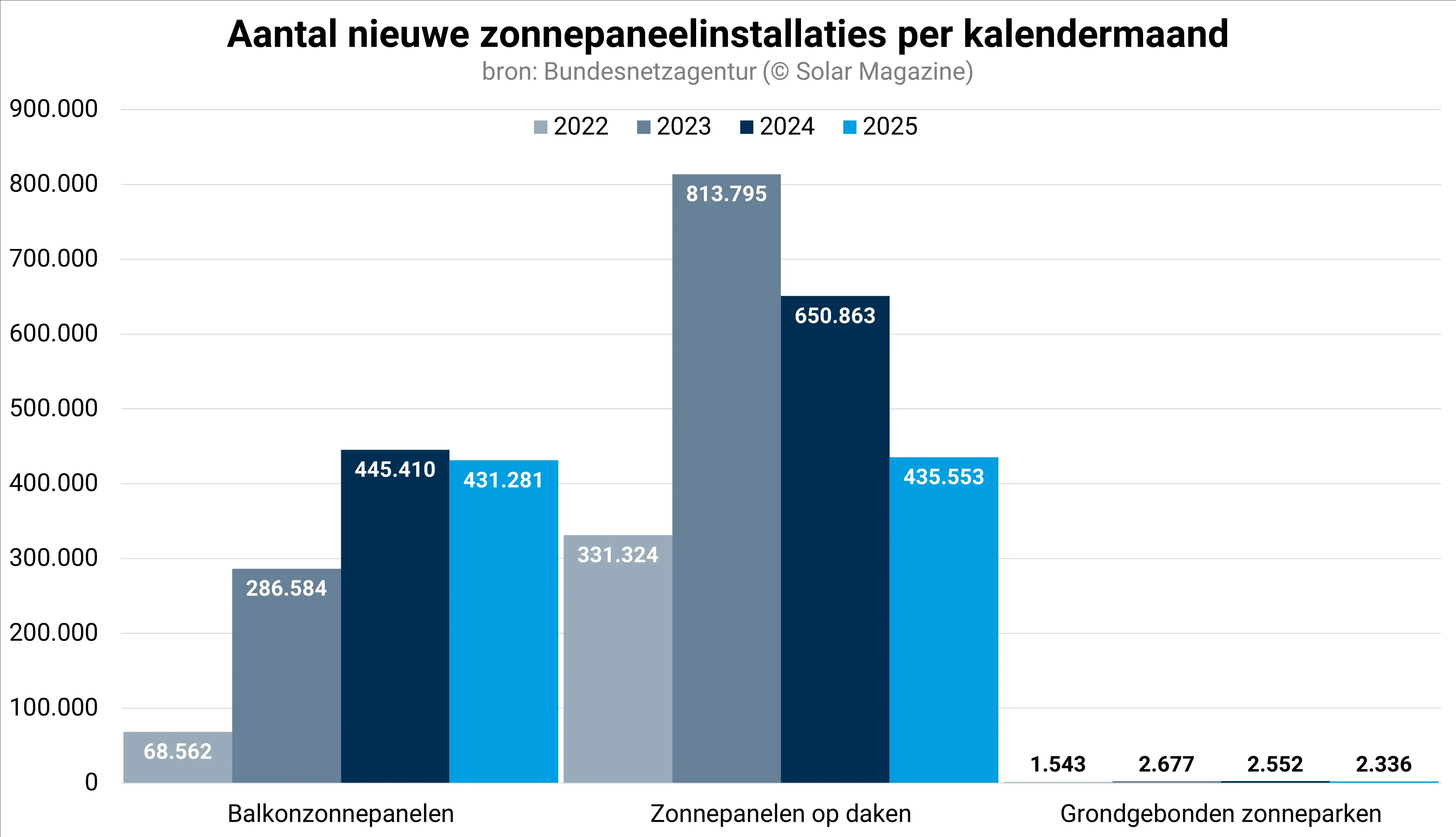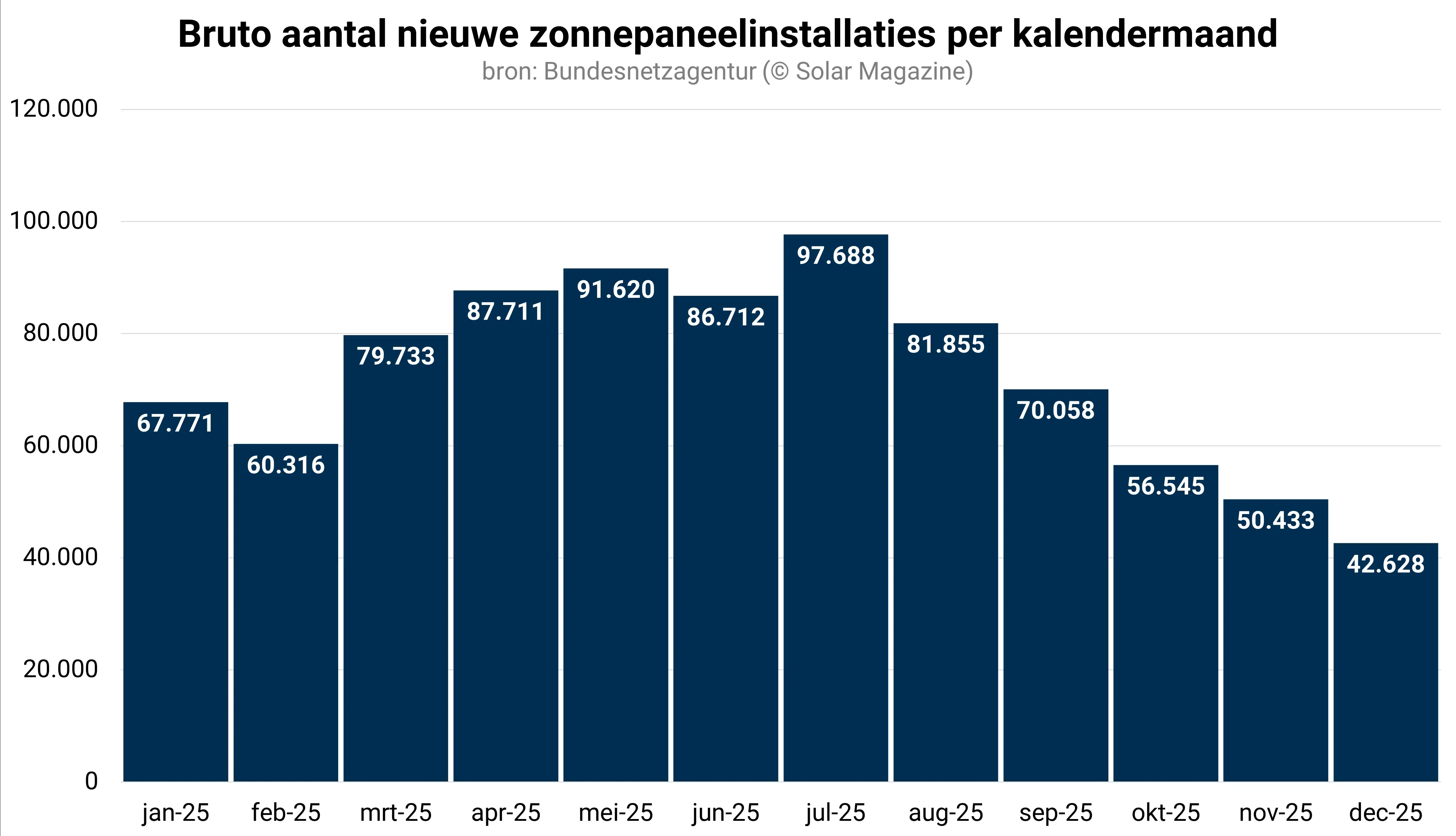 Maandelijks verwelkomde Duitsland in 2025 gemiddeld zo’n 73.000 zonnepaneelinstallaties, goed voor een maandelijks nieuw geplaatst vermogen van bijna 1,4 gigawattpiek.