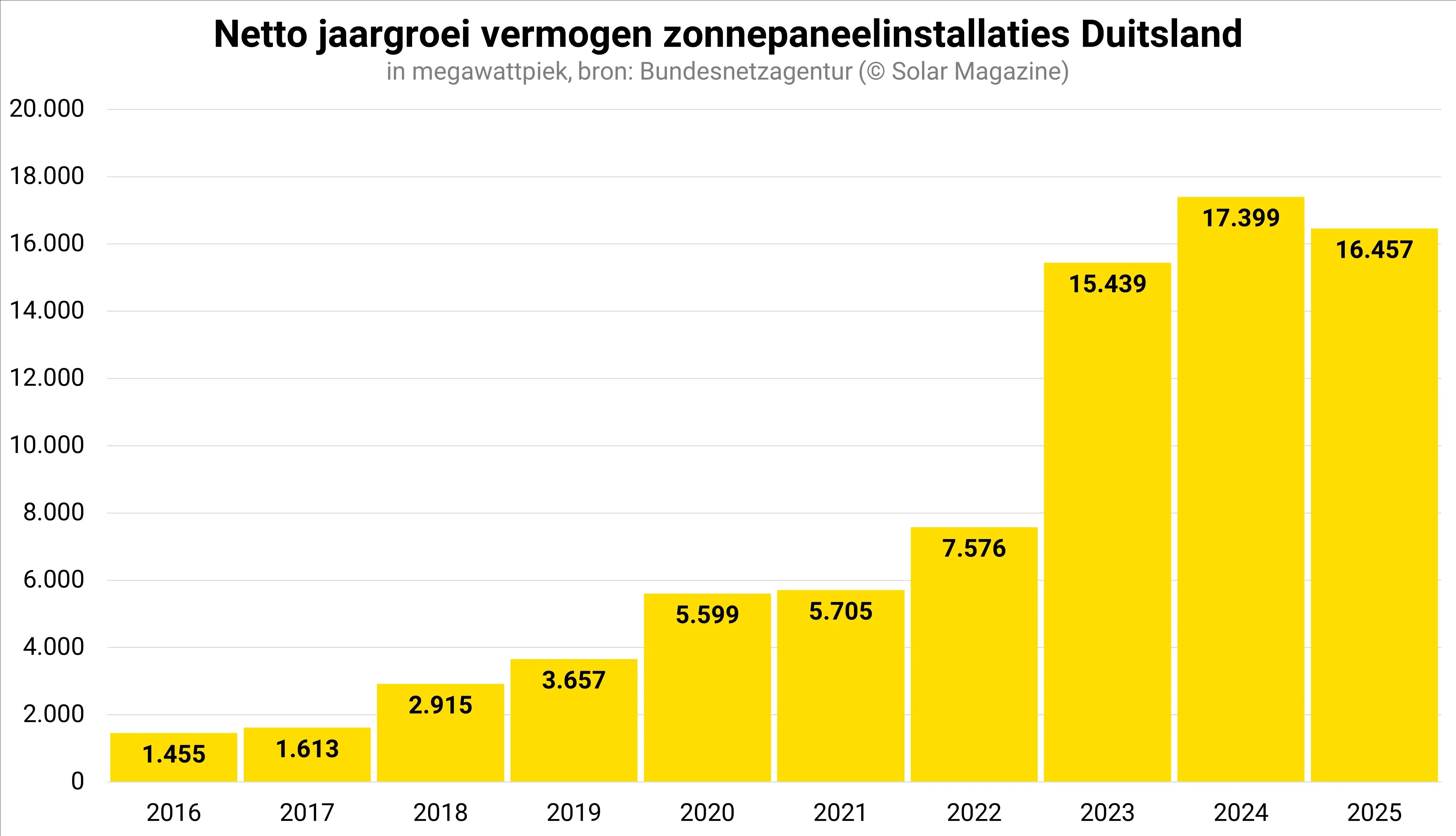 Dit alles blijkt uit de nieuwste cijfers van de Bundesnetzagentur (BNetzA). Met de nieuwe zonnepaneelinstallaties was netto een vermogen van bijna 16,5 gigawattpiek gemoeid.