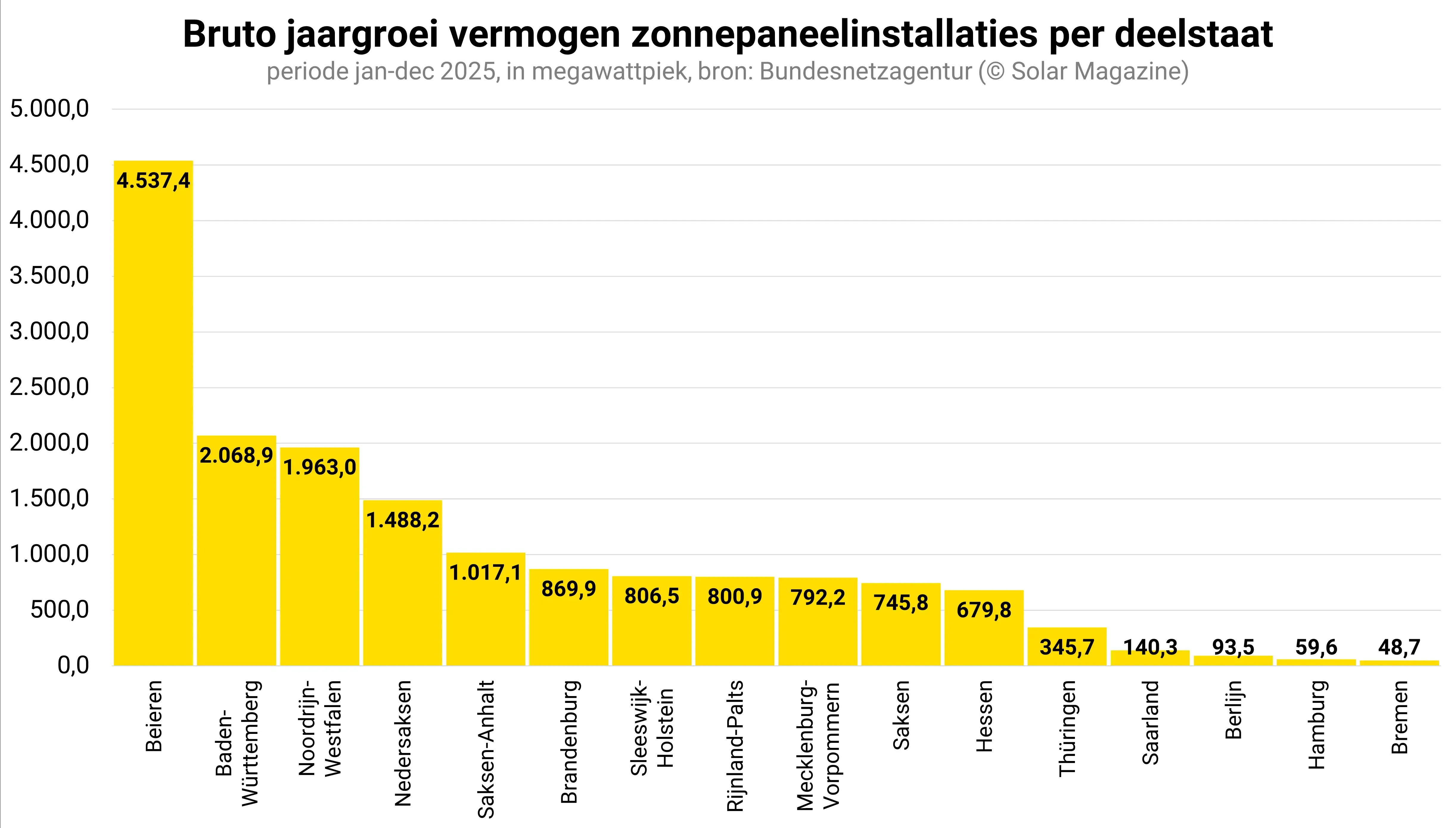 Beieren domineert met 4.537,4 megawattpiek in 2025 de zonnepaneelverkoop. De deelstaat installeerde ruim twee keer zoveel zonnepanelen als runner-up Baden-Württemberg met 2.068,9 megawattpiek. De top 3 wordt gecompleteerd door Noordrijn-Westfalen dat 1.963,0 megawattpiek verwelkomde.