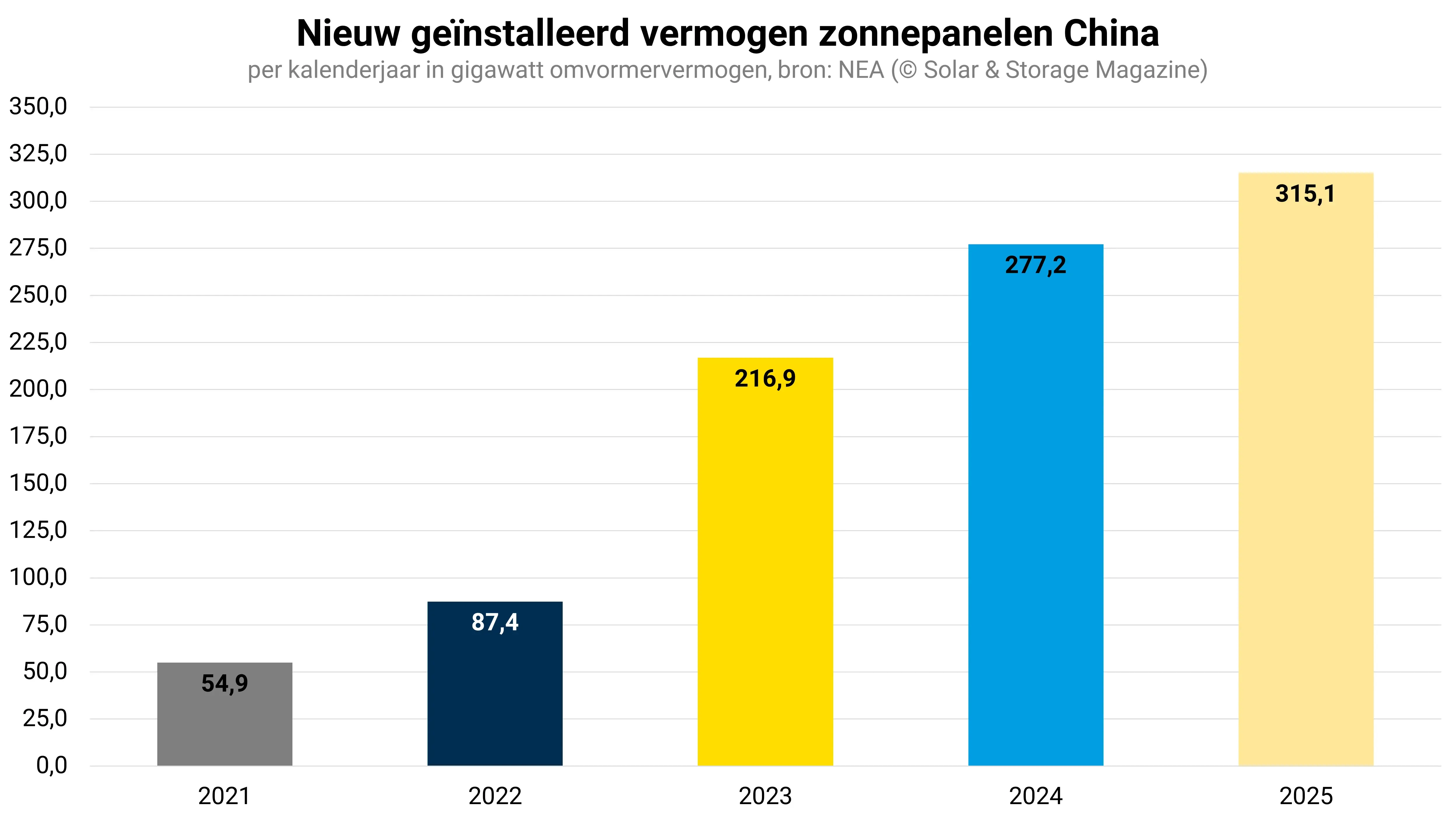 De 315 gigawatt betekent een groei van bijna 14 procent vergeleken met de 277,17 gigawatt AC die het land in 2024 installeerde. De totale geïnstalleerde zonne-energiecapaciteit in China steeg daarmee naar 1,2 terawatt omvormervermogen eind 2025, een stijging van 35,4 procent op jaarbasis. Dit alles blijkt uit cijfers van de Chinese energieautoriteit National Energy Administration (NEA).