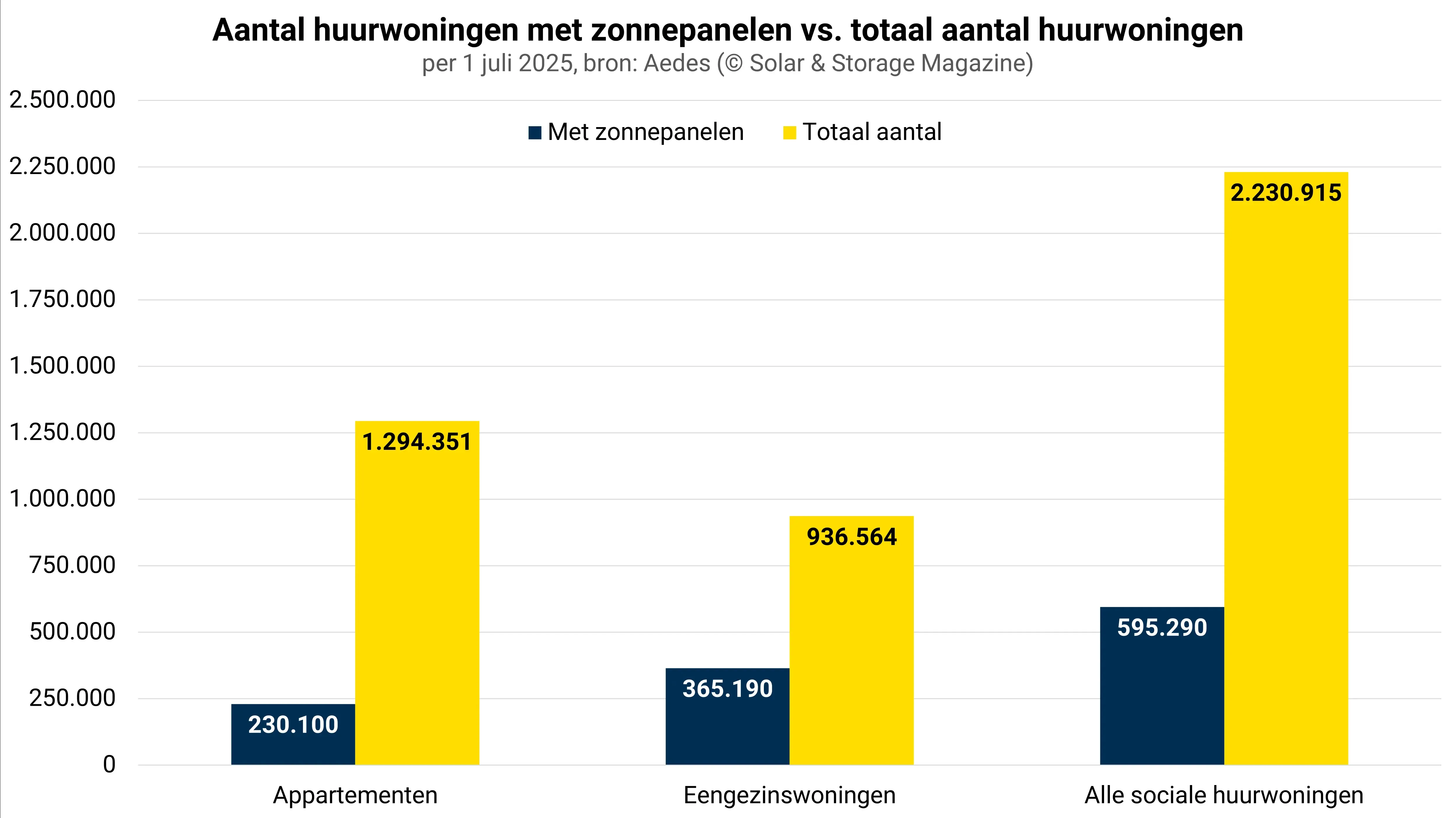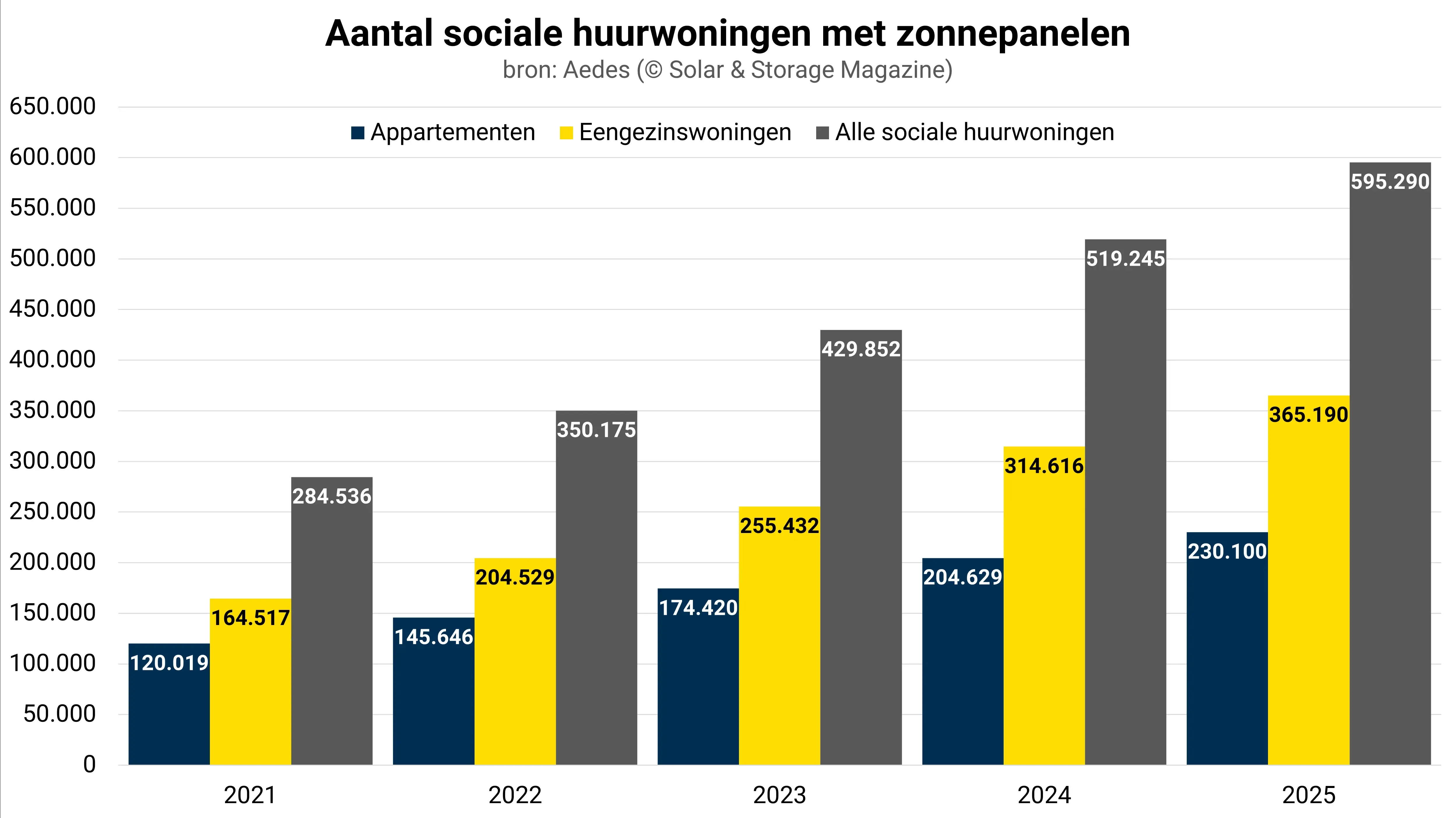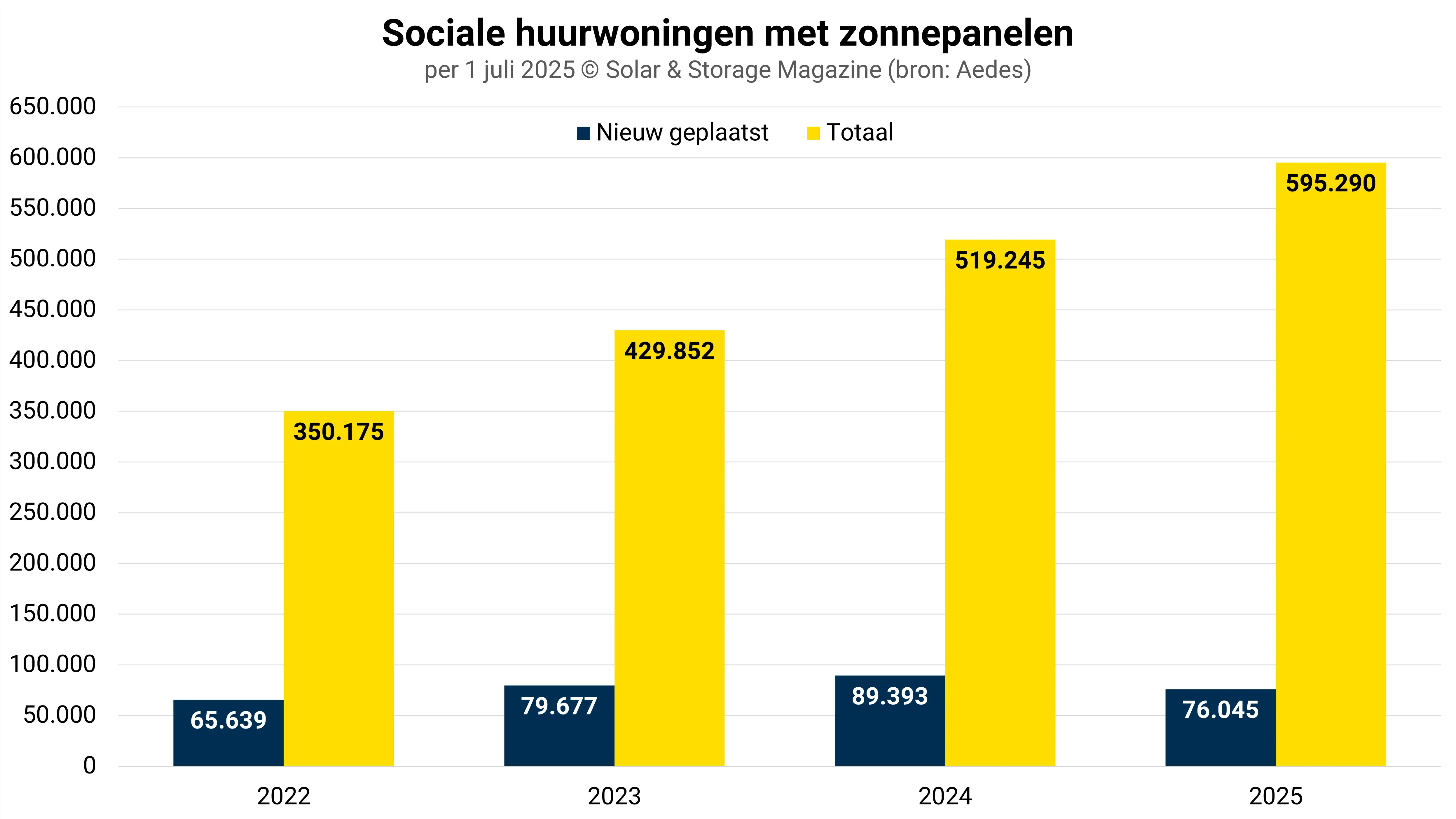 Van de ruim 2,2 miljoen huurwoningen van woningcorporaties zijn er inmiddels bijna 600.000 met zonnepanelen uitgerust.