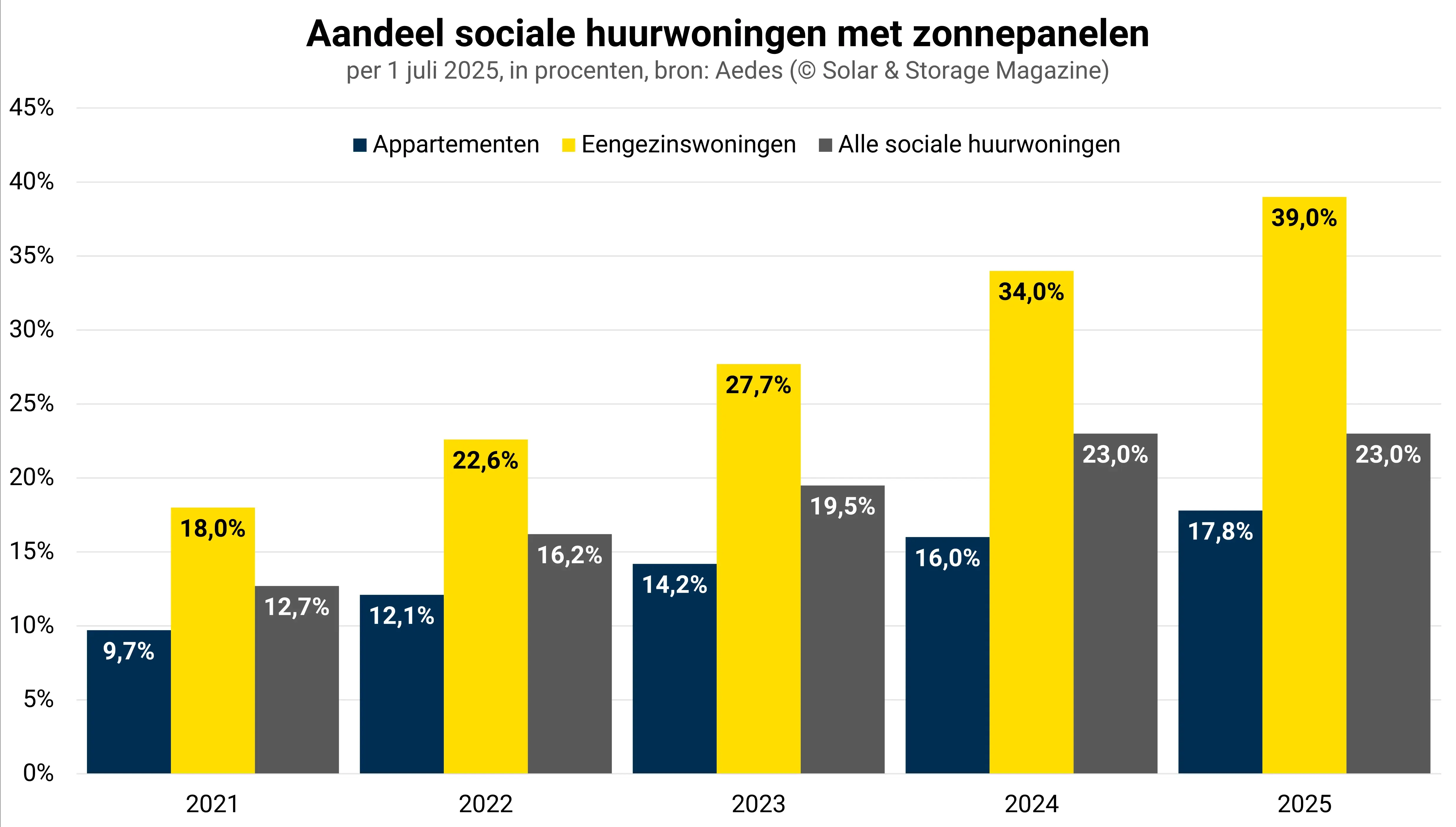 In 2025* werden daarbij zonnepanelen geplaatst op 25.471 daken van woningen in een appartementencomplex en op 50.574 daken van eengezinswoningen waarmee 76.045 nieuwe zonnedaken op sociale huurwoningen zijn gerealiseerd.