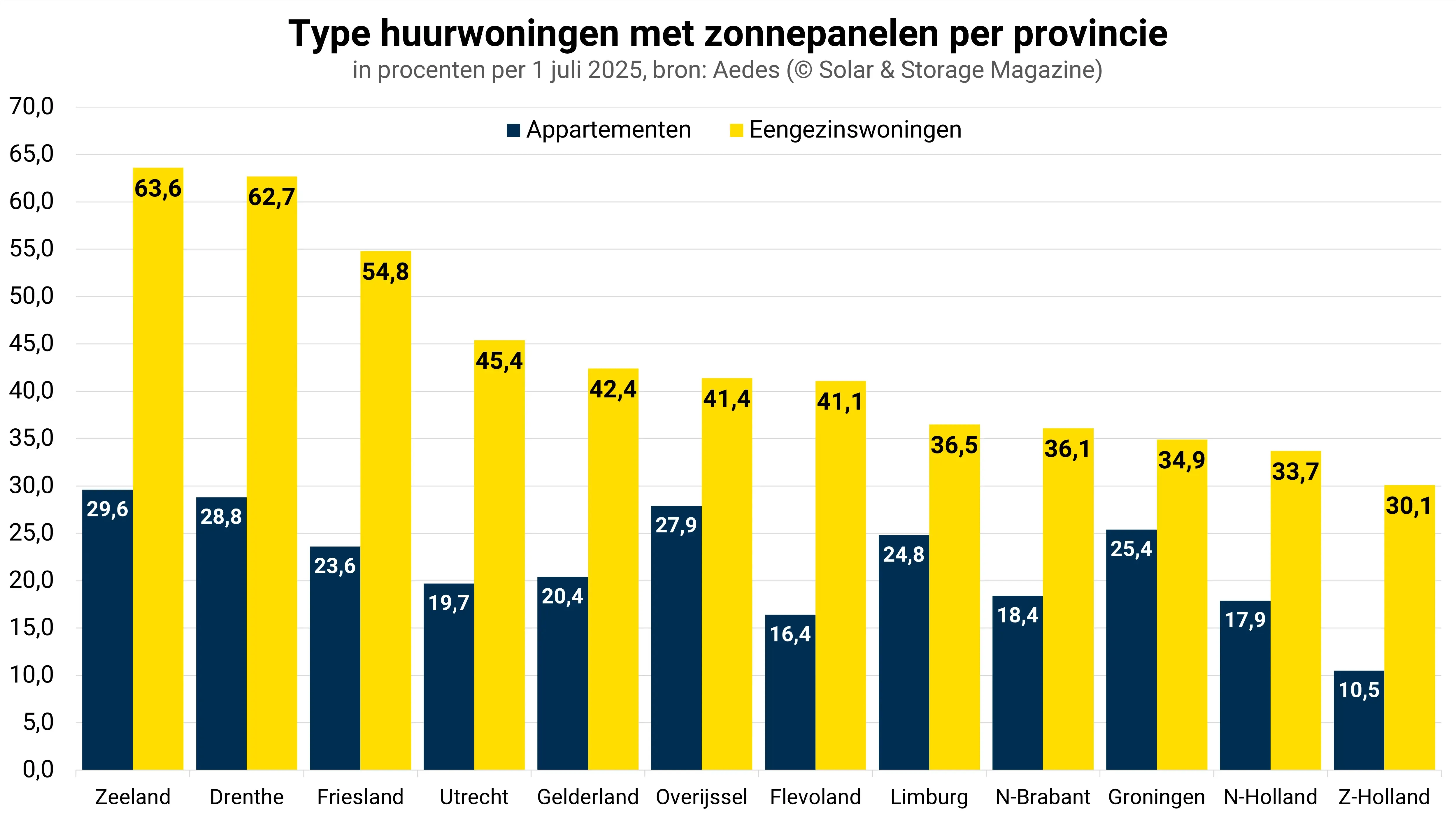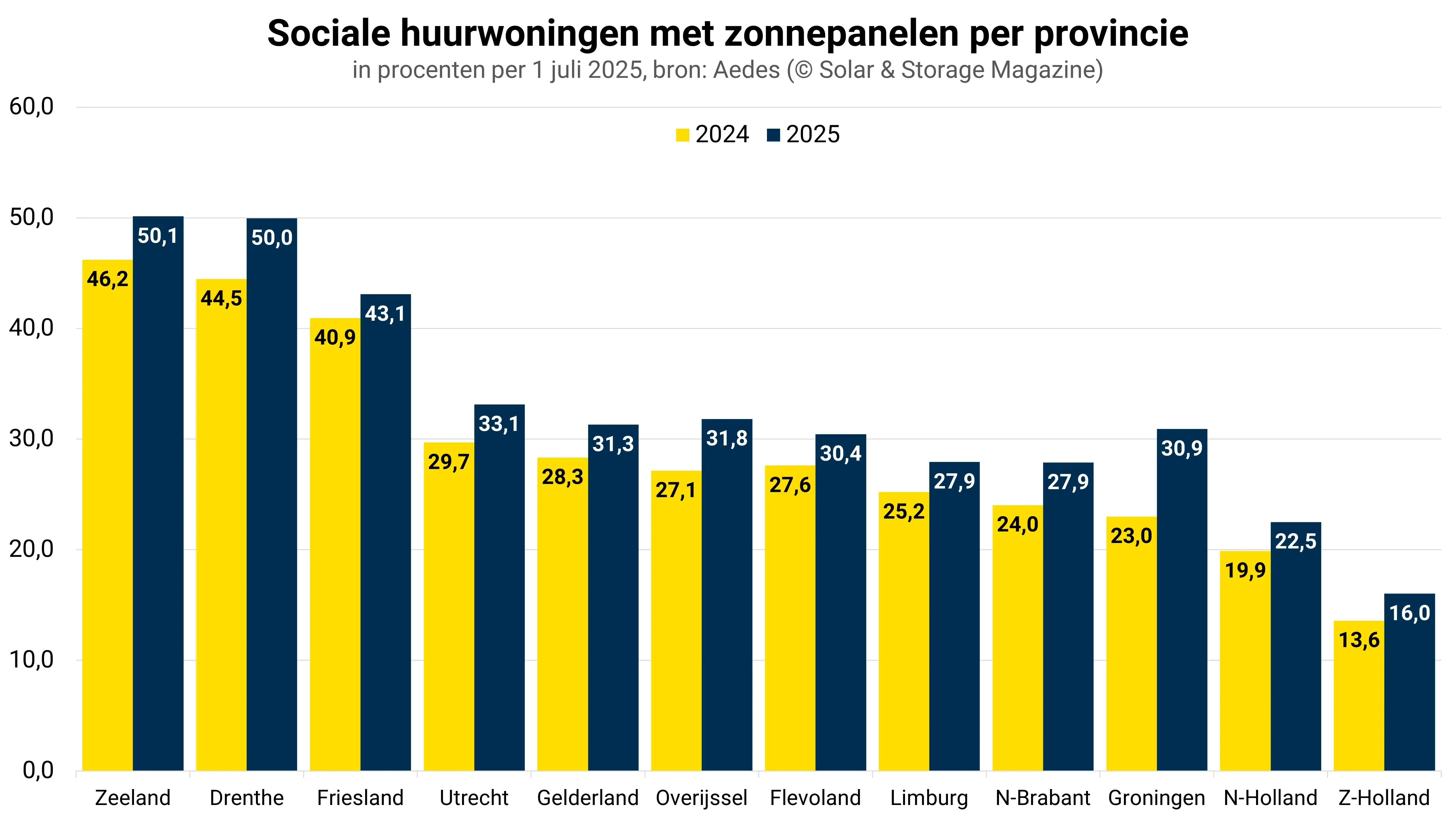 Zeeland leidt niet alleen bij appartementsgebouwen de dans, want ook bij het totale percentage sociale huurwoningen met zonnepanelen zijn de Zeeuwen koploper. De provincie is zelfs de magische grens gepasseerd waarbij de helft van de sociale huurwoningen zonnepanelen heeft.
