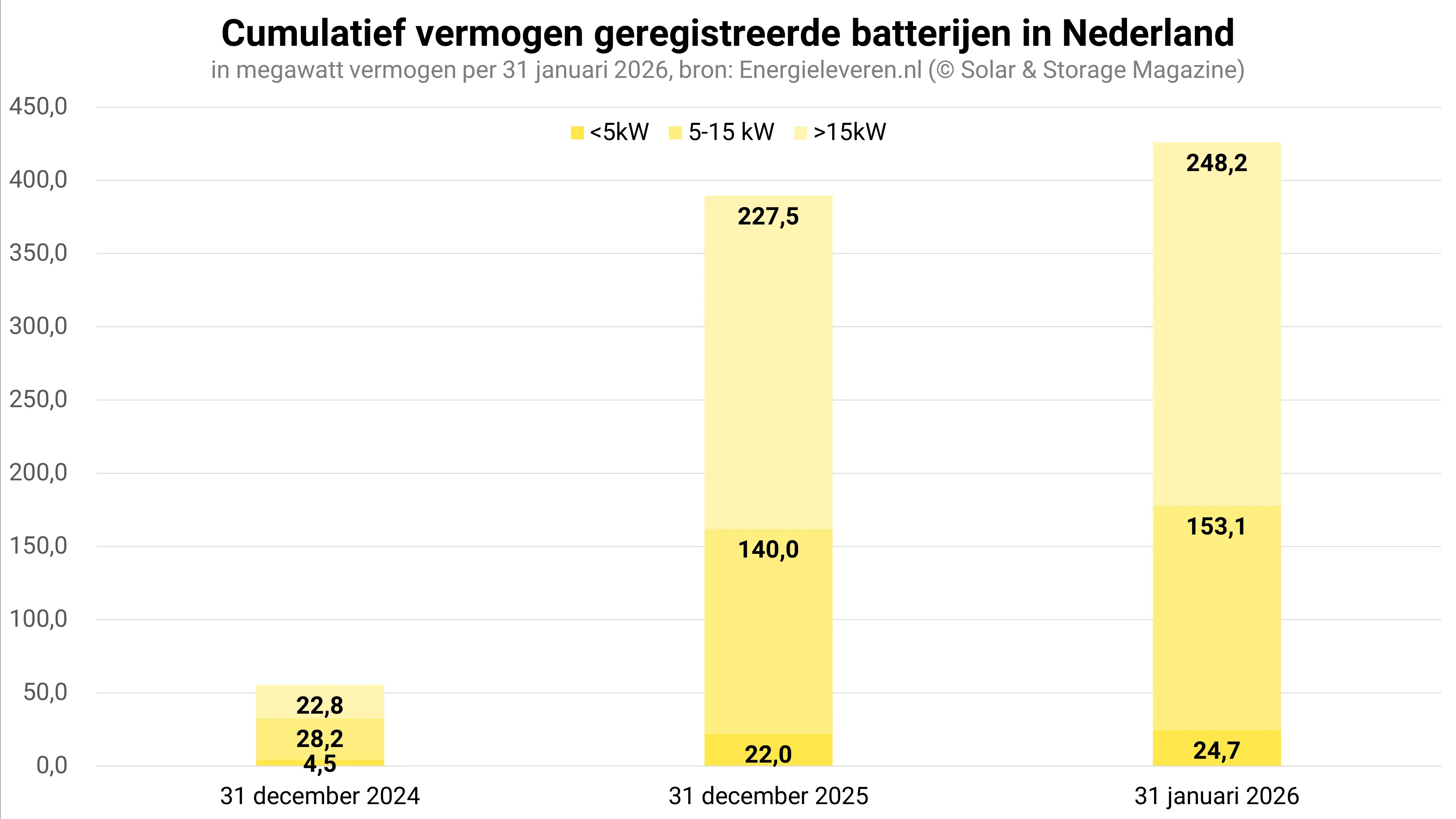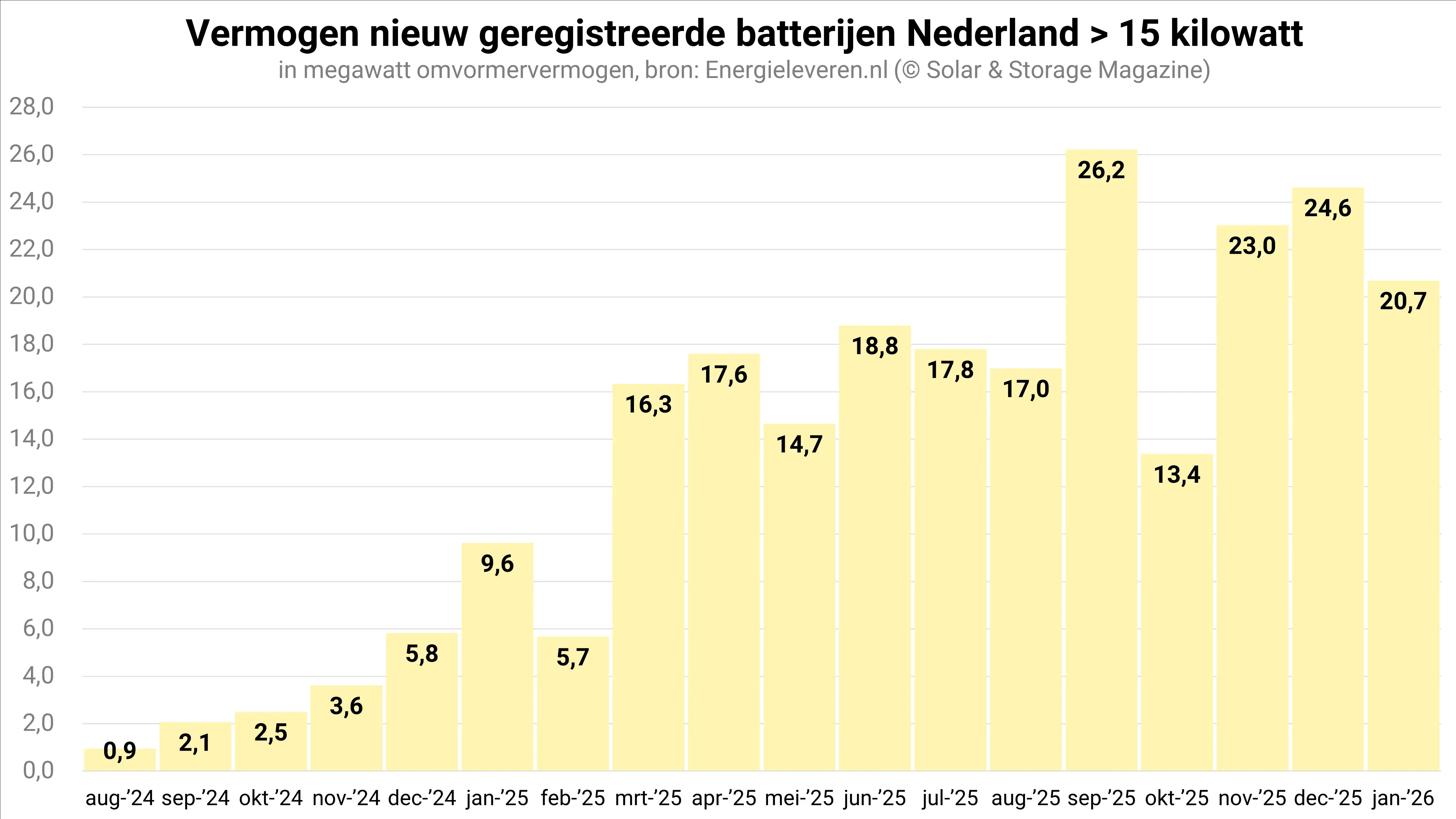 De categorie van de grotere batterijen – die met een vermogen boven de 15 kilowatt maar onder 1 megawatt – liet in 2025 een vrijwel onophoudelijke groei zien. In de maand januari was een lichte daling zichtbaar, maar desondanks was de maand januari nog altijd de op een na beste maand in de geschiedenis. In januari 2026 werden 194 batterijen geregistreerd. Ter vergelijking: dat zijn er ruim 3,5 keer zoveel als in januari 2025. Deze batterijen bevinden zich vermoedelijk bijna allemaal in het zakelijke segment, waar onder meer agrariërs en bedrijven die met netcongestie kampen de batterij massaal omarmen.