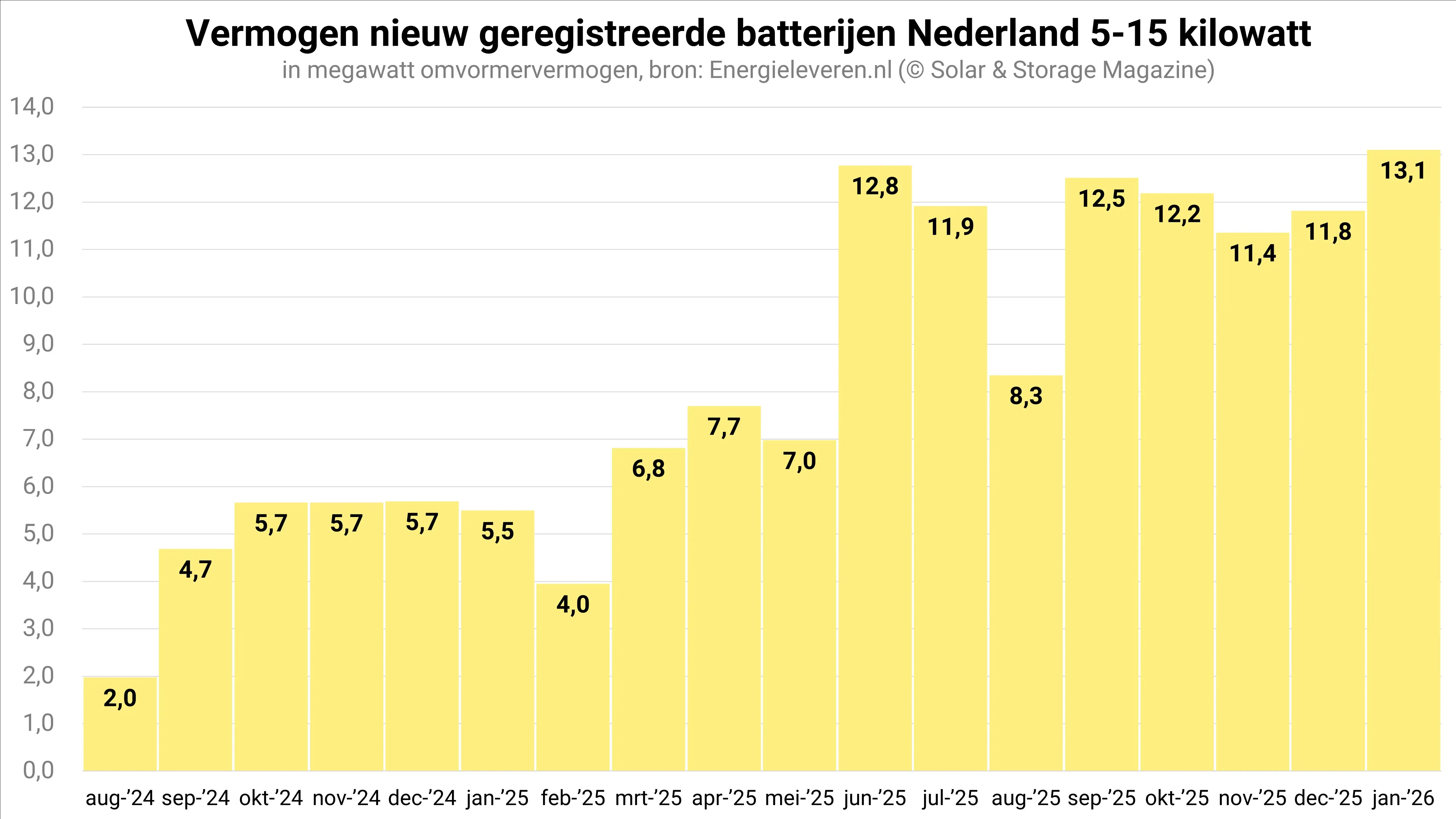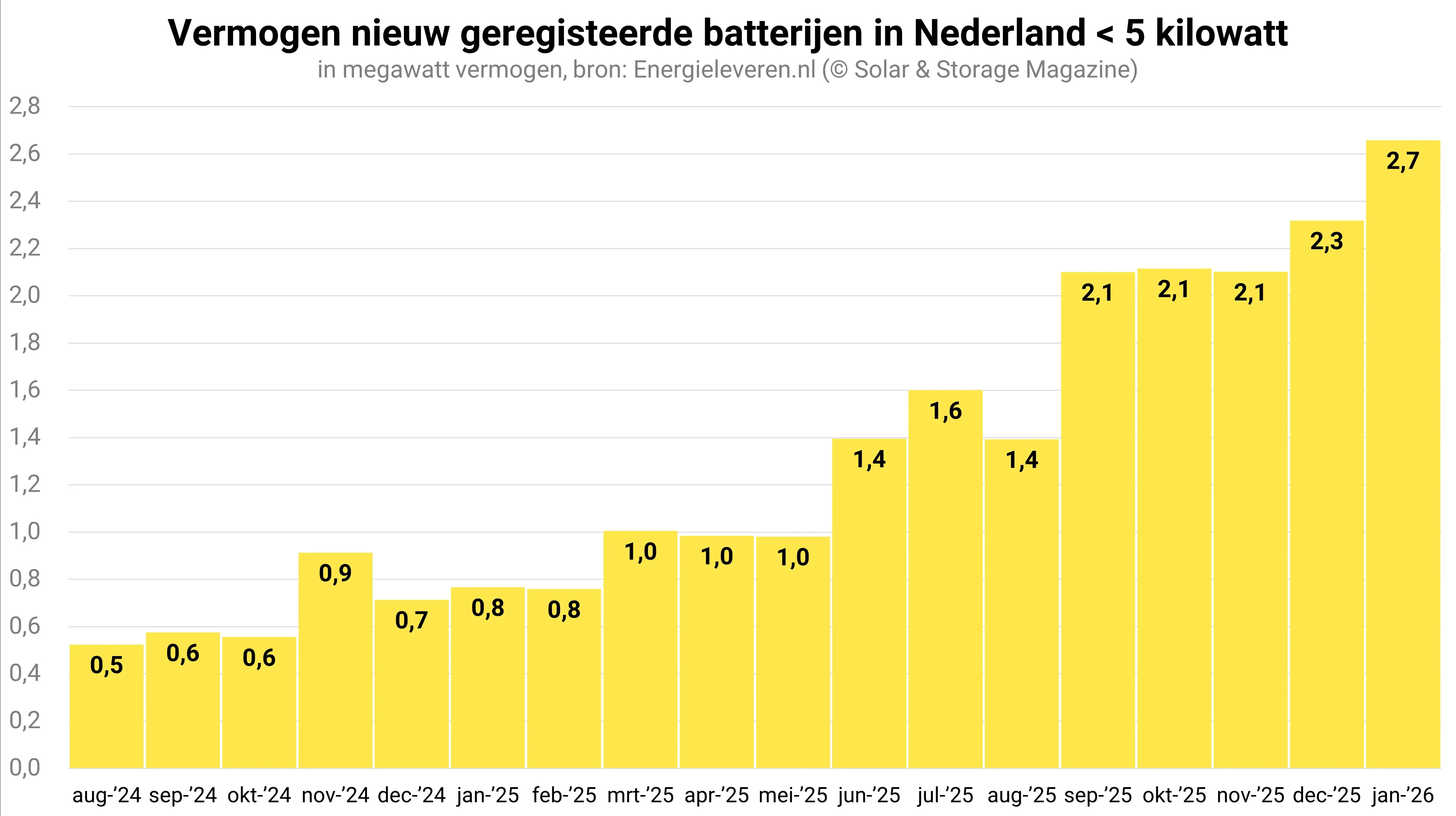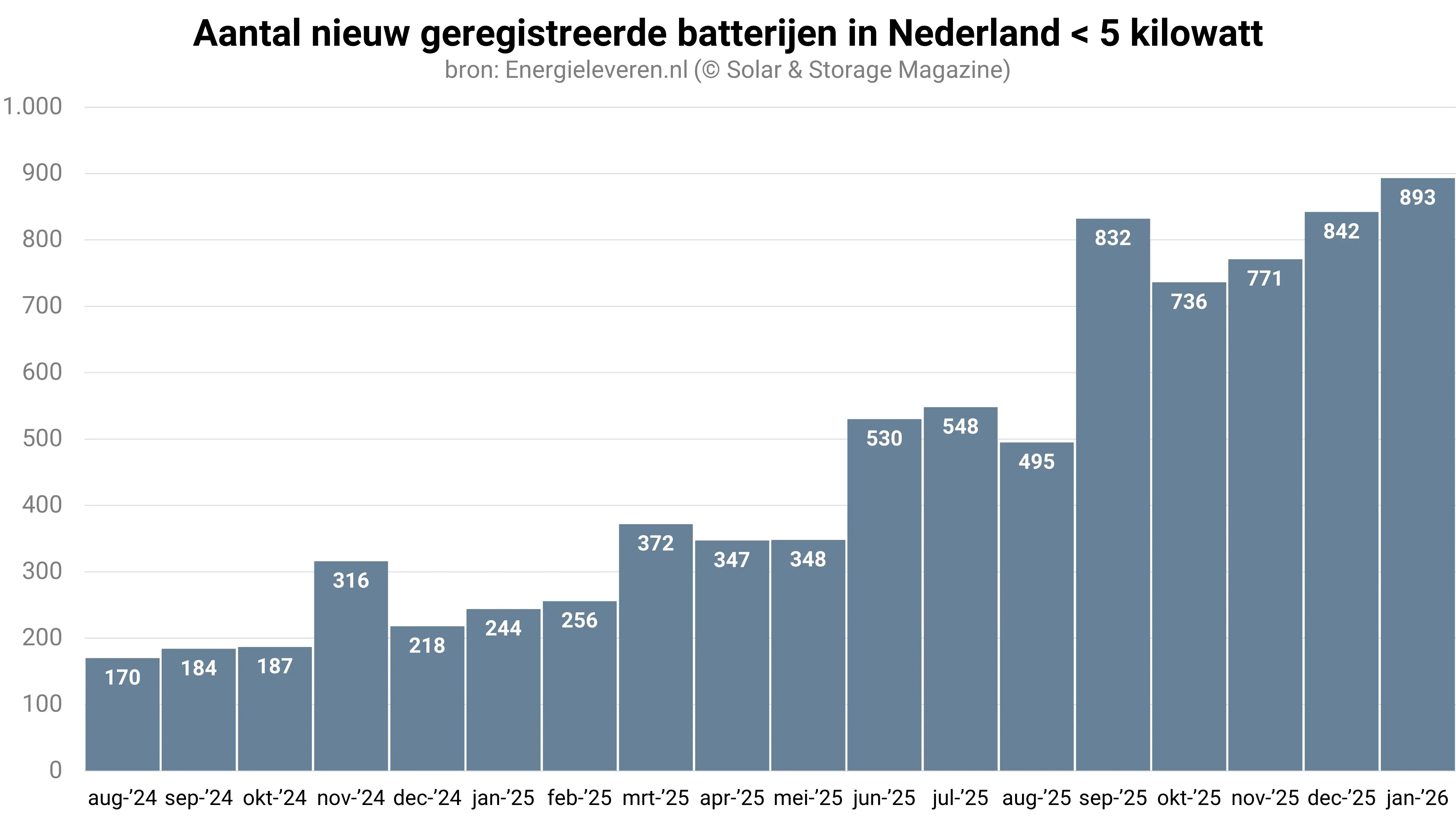 Het aantal geregistreerde batterijen met een vermogen tot 5 kilowatt nam sinds september fors toe. Waar het in het vierde kwartaal van 2025 om gemiddeld 783 nieuw geregistreerde batterijen per maand ging, lag het registratieniveau in het eerste kwartaal van 2025 op slechts 291 nieuw geregistreerde batterijen. In januari 2026 ging het om een recordaantal van 893 batterijen. Het daarmee gemoeide vermogen steeg eveneens naar een recordhoogte van 2,7 megawatt.