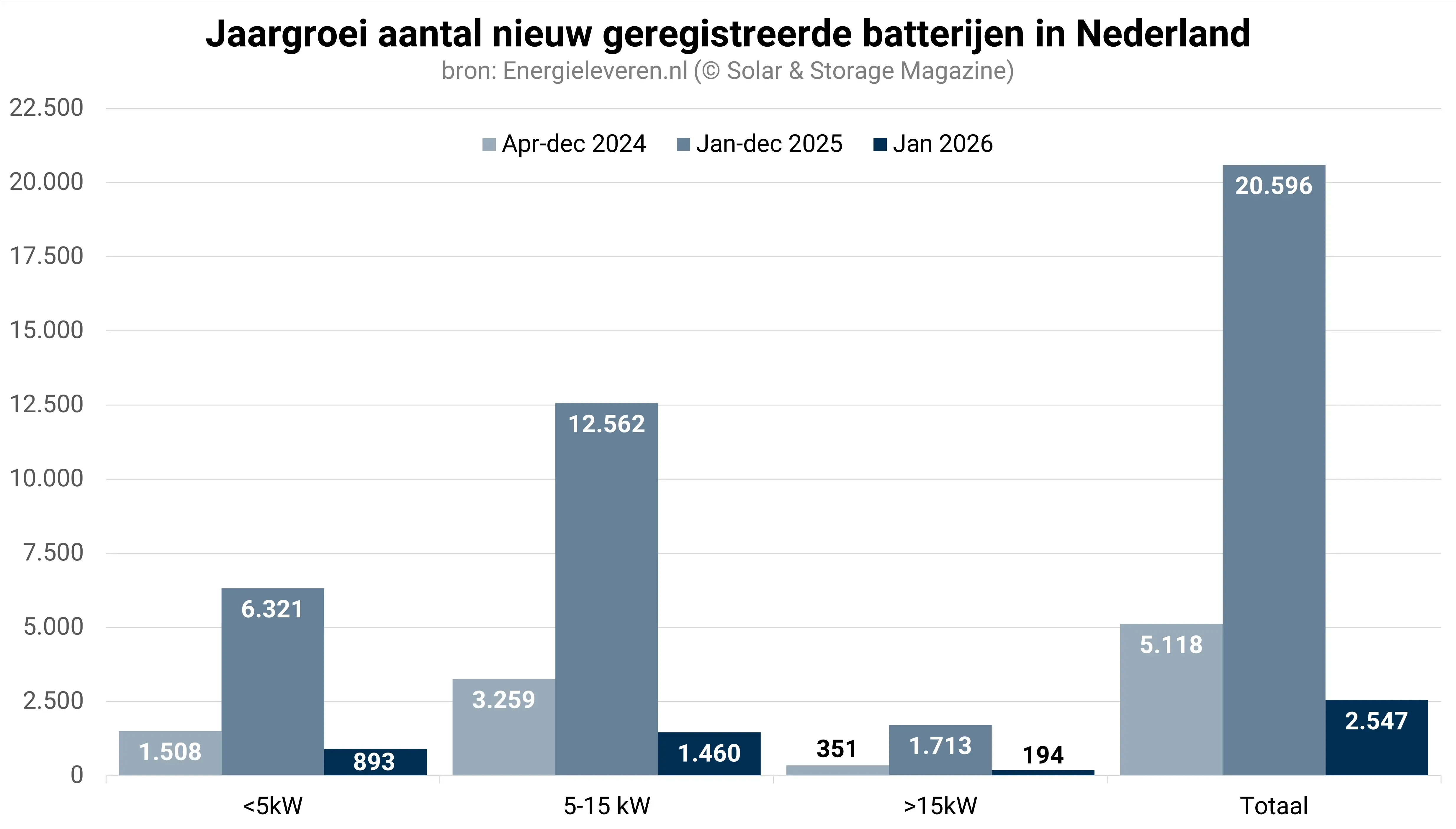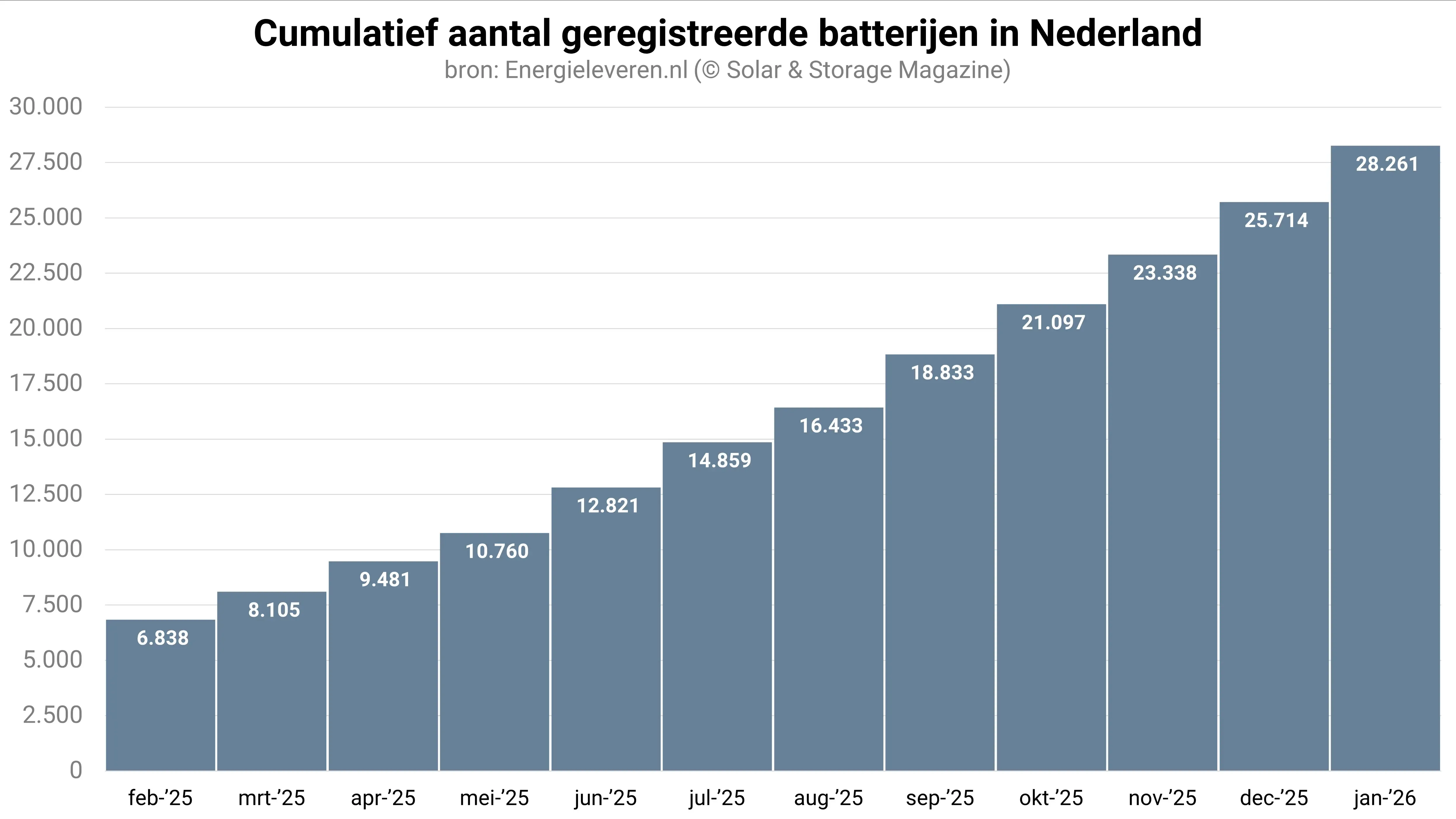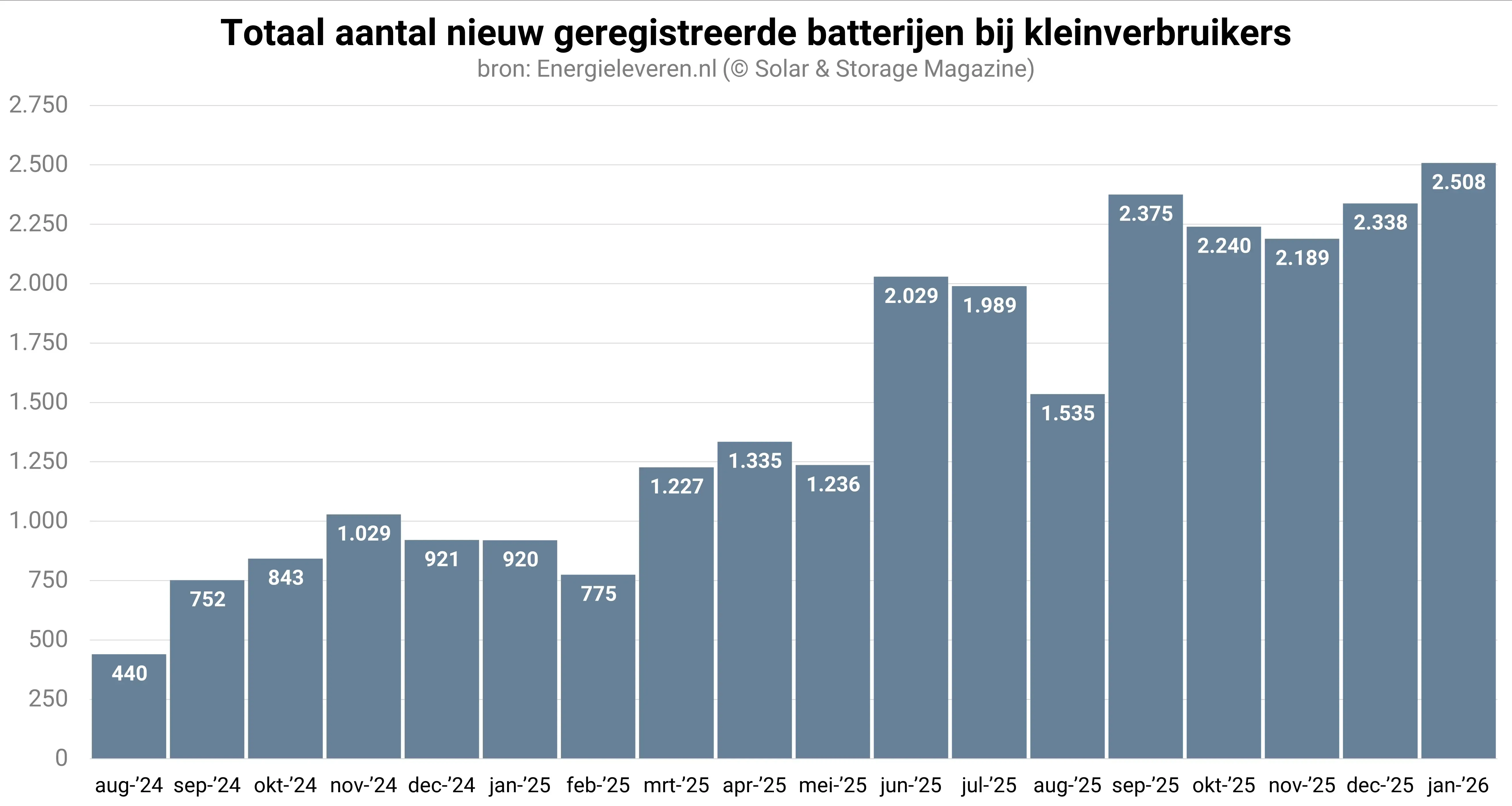 Het aantal geregistreerde batterijen met een vermogen tot 5 kilowatt nam sinds september fors toe. Waar het in het vierde kwartaal van 2025 om gemiddeld 783 nieuw geregistreerde batterijen per maand ging, lag het registratieniveau in het eerste kwartaal van 2025 op slechts 291 nieuw geregistreerde batterijen. In januari 2026 ging het om een recordaantal van 893 batterijen. Het daarmee gemoeide vermogen steeg eveneens naar een recordhoogte van 2,7 megawatt.