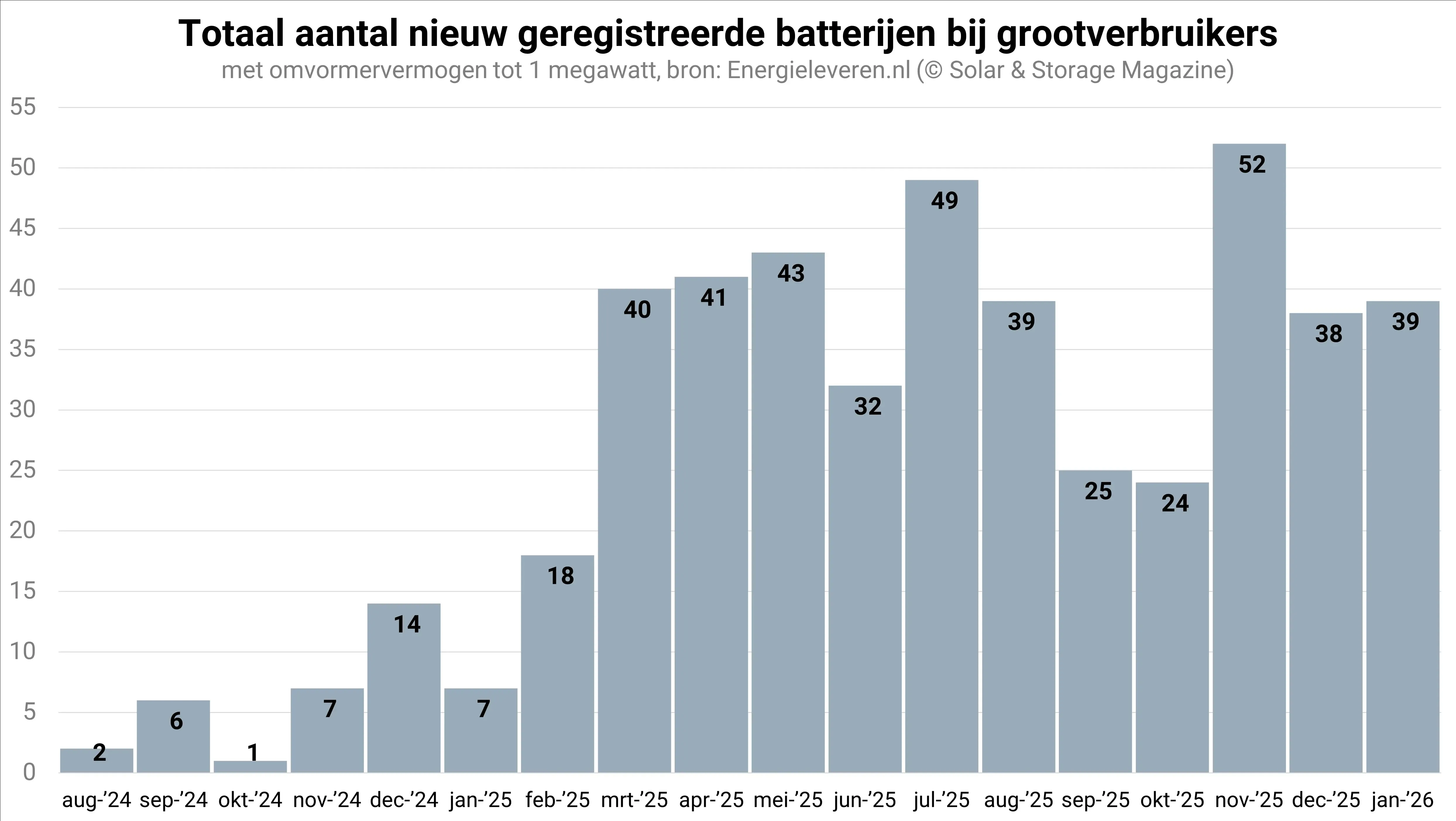 Bij grootverbruikers steeg het aantal in januari nieuwe geregistreerde batterijen marginaal, van 38 naar 39 batterijen.