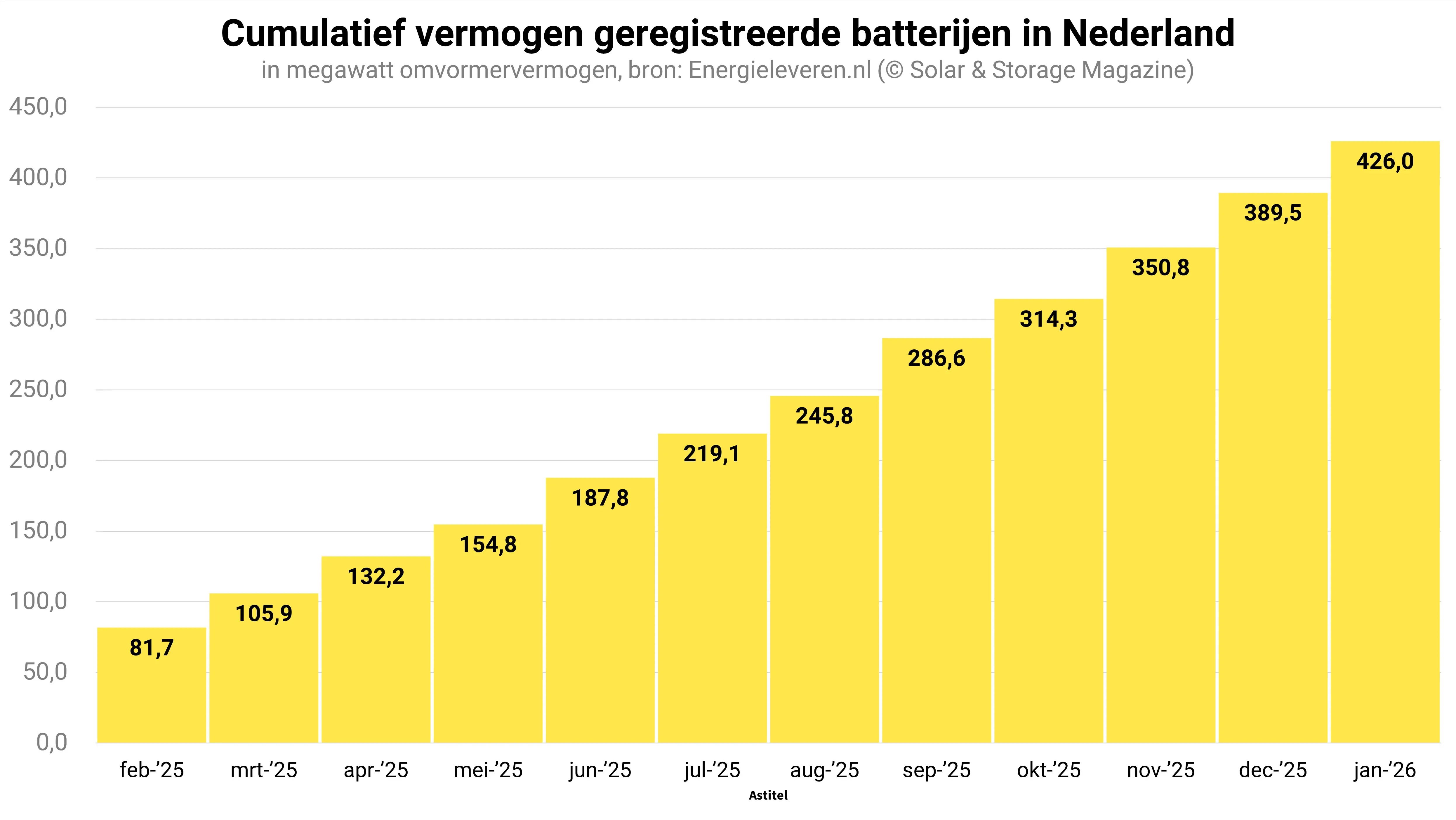 Het door de regionale netbeheerders cumulatief geregistreerd batterijvermogen bevindt zich daarbij op 426 megawatt.