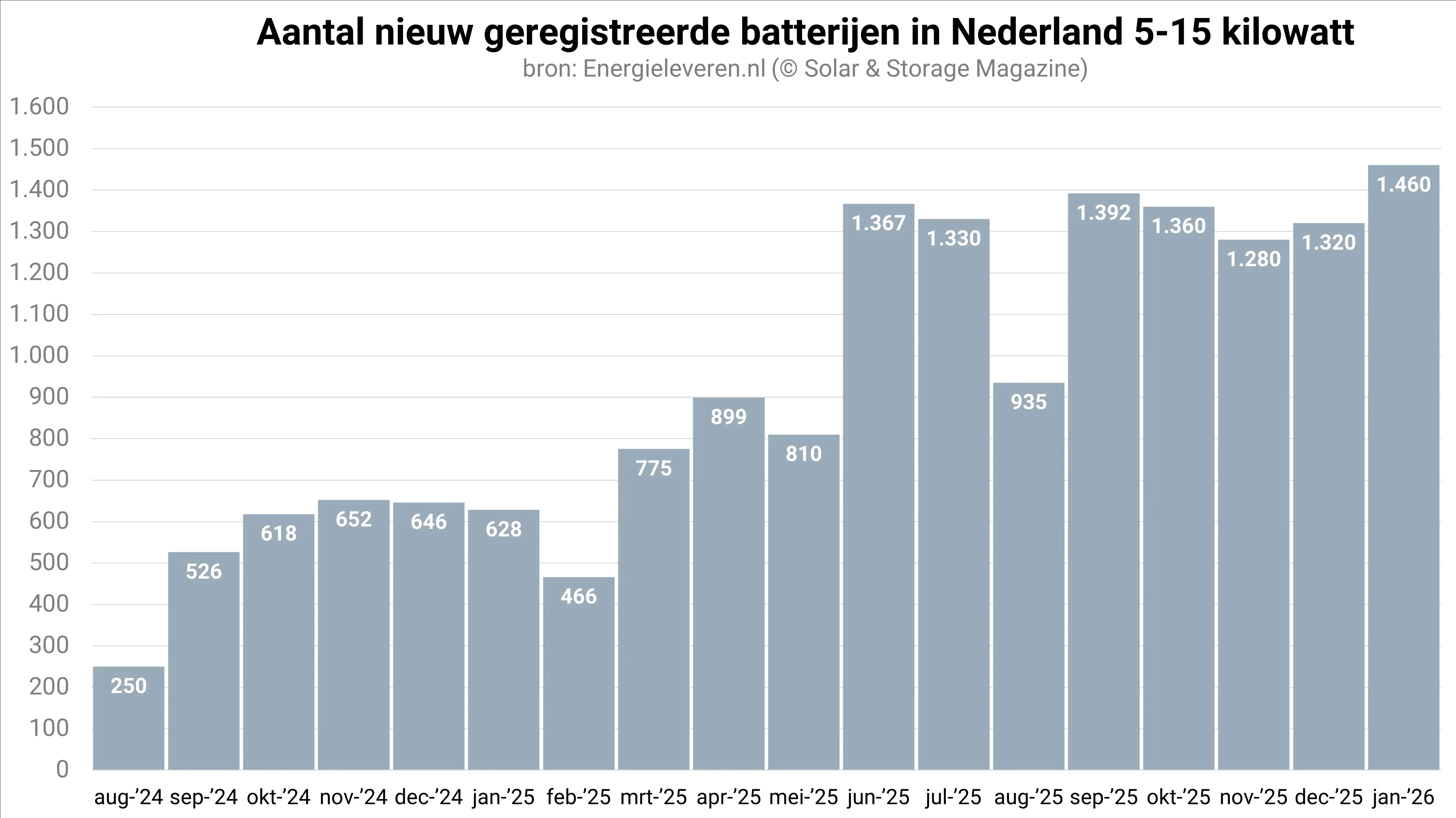 In de categorie van batterijen met een vermogen van 5 tot 15 kilowatt werd in januari een recordaantal van 1.460 nieuwe batterijen geregistreerd.