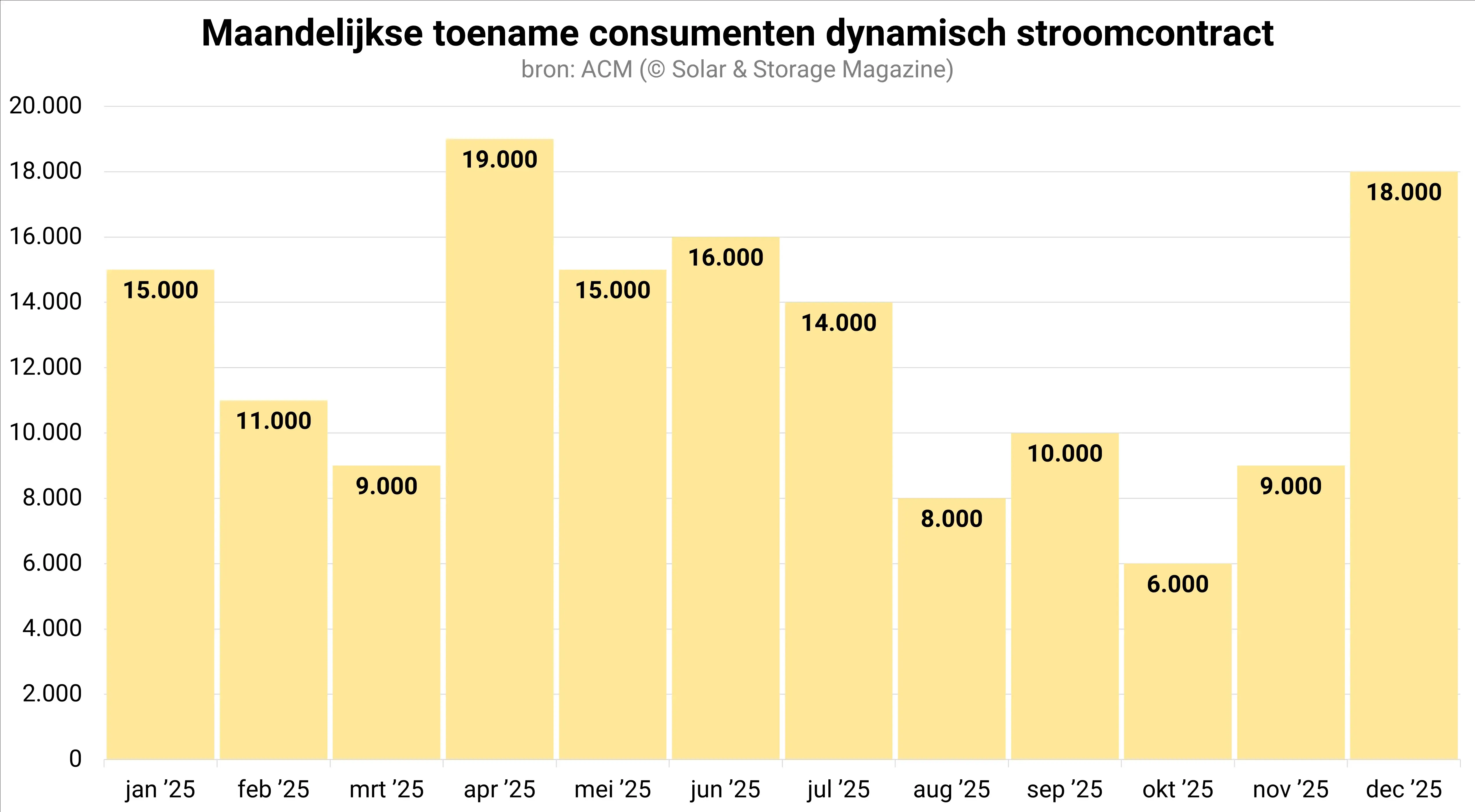 Waar de maandelijkse groei van het aantal dynamische stroomcontracten in 2024 op 13.417 stuks lag, is de gemiddelde maandelijkse groei in 2025 uitgekomen op 12.500 stuks. 150.000 consumenten stapten in 2025 over op een dynamisch energiecontract voor stroom, terwijl dat er in 2024 nog 161.000 waren. Daarmee is het groeitempo met ongeveer 7 procent gedaald.