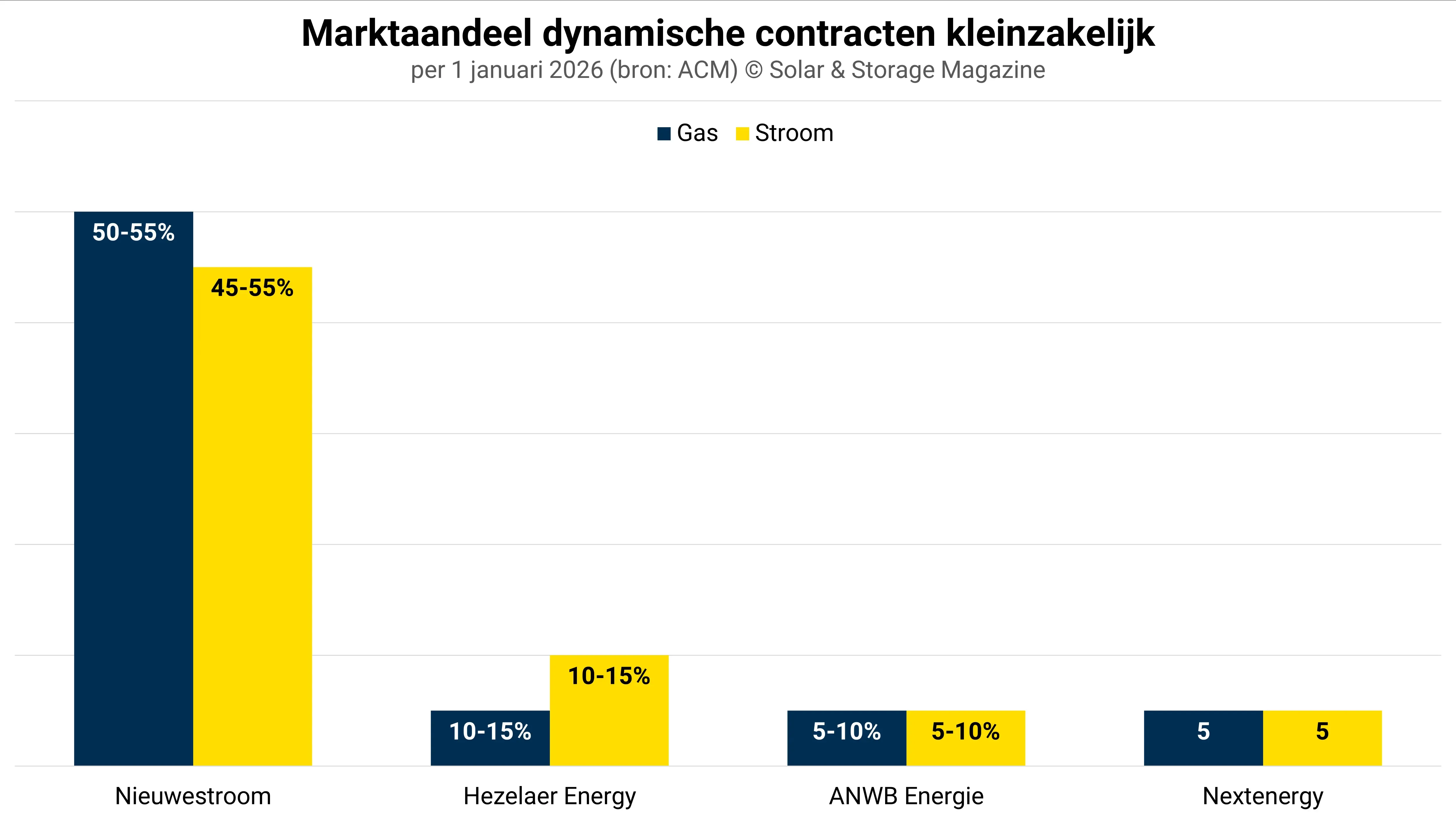 Het aantal Nederlanders met een dynamisch energiecontract voor gas ligt een stuk lager, te weten op 387.000 stuks. Wat neerkomt op ongeveer 6 procent van alle gascontracten van Nederlandse huishoudens. In de zakelijke markt is het aantal kleinzakelijke bedrijven met een dynamisch stroomcontract gestabiliseerd op 73.000 stuks en voor gas op 48.000 stuks.