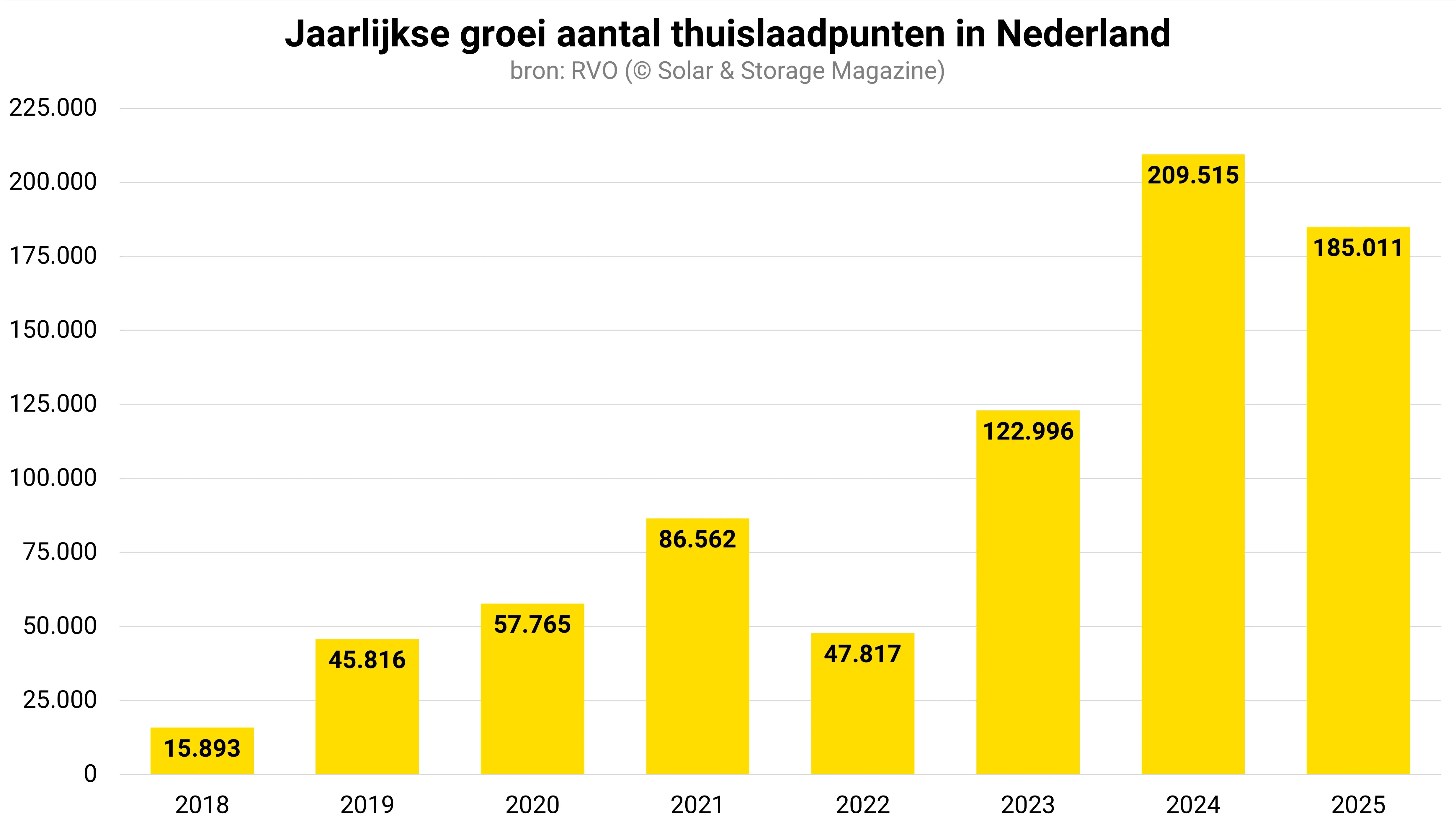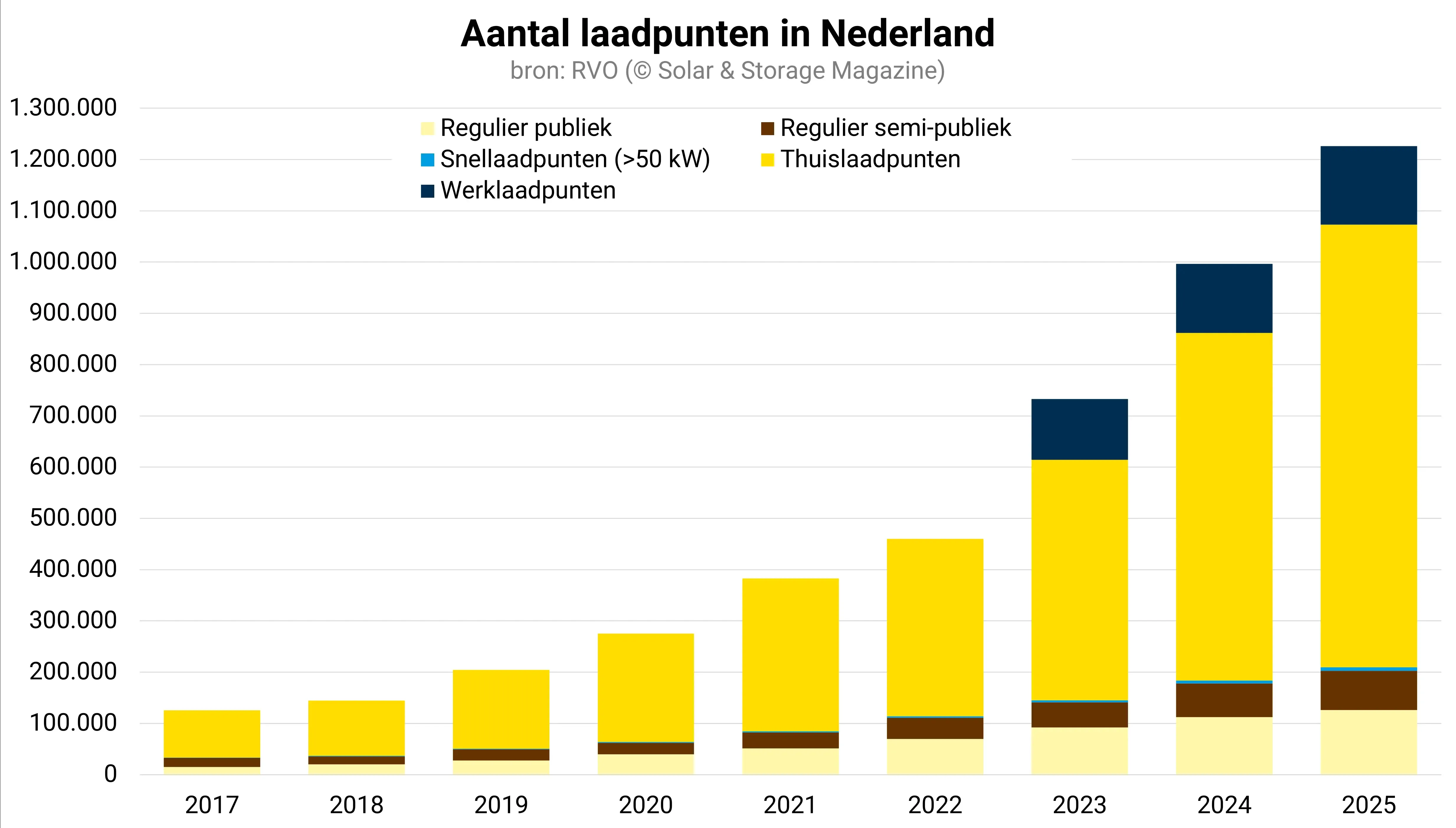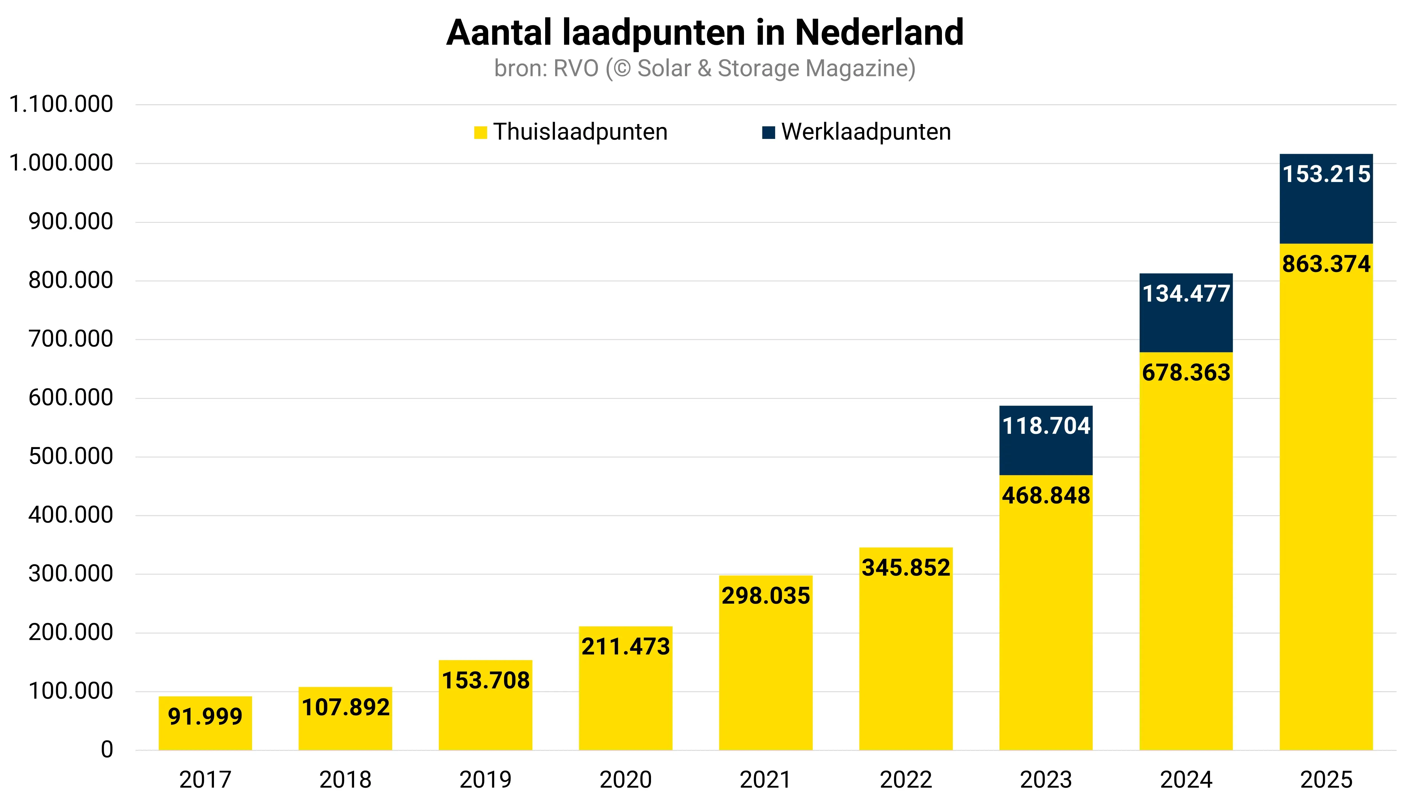 De cijfers van RVO tonen een opmerkelijk patroon. Waar in 2017 nog slechts 91.999 thuislaadpunten stonden geregistreerd, nadert het aantal nu de miljoen.