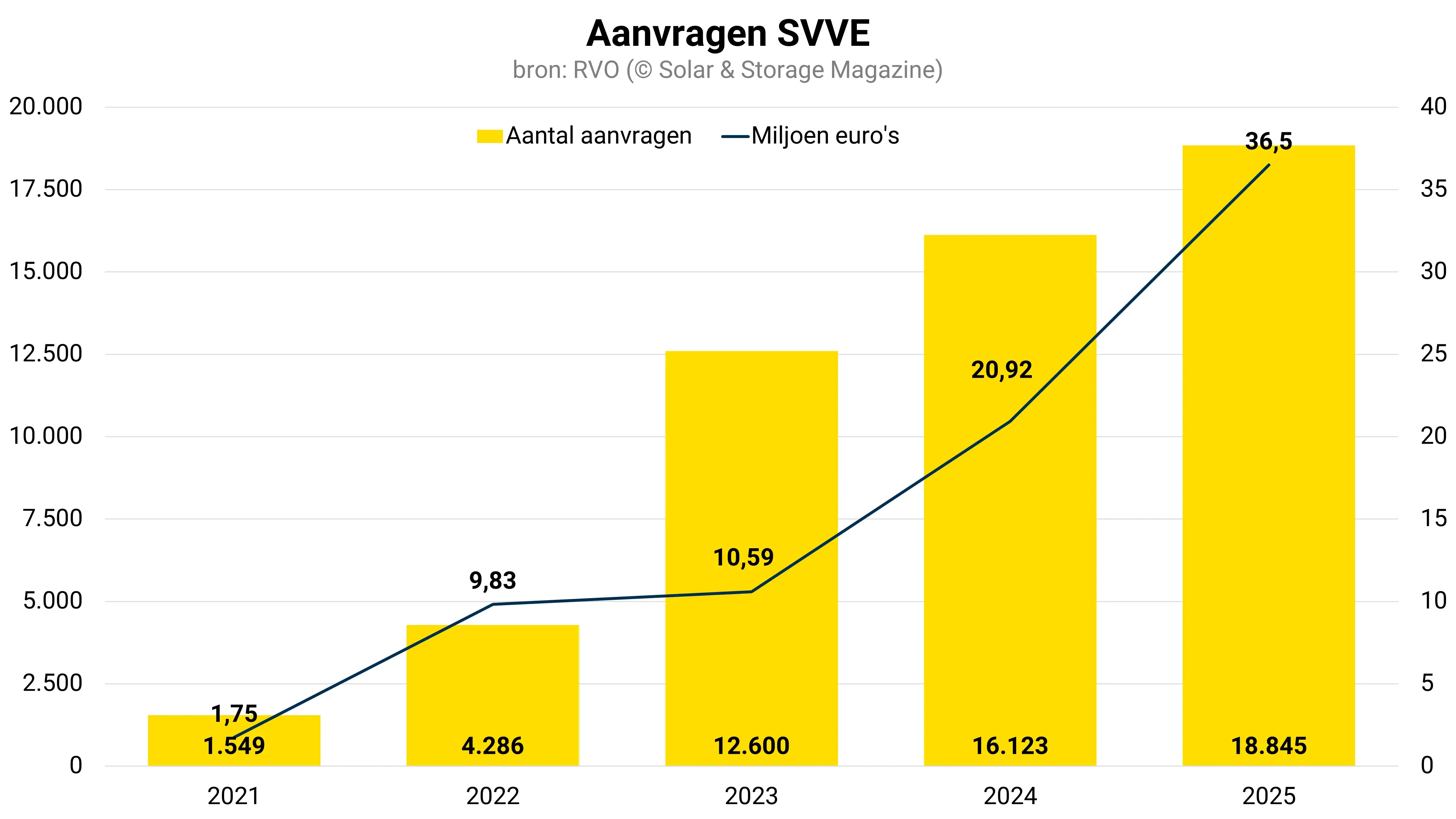 Uit een inventarisatie van de Rijksdienst voor Ondernemend Nederland (RVO) blijkt dat de Subsidieregeling Verduurzaming voor Verenigingen van Eigenaars (SVVE) wel aan populariteit wint bij Verenigingen van Eigenaars (VvE’s). Wel groeit het gebruik van de regeling: in 2017 vroegen VvE’s, woonverenigingen en woningcoöperaties gezamenlijk nog circa 2,4 miljoen euro subsidie aan, terwijl dit in 2025 opliep tot 36,5 miljoen euro.