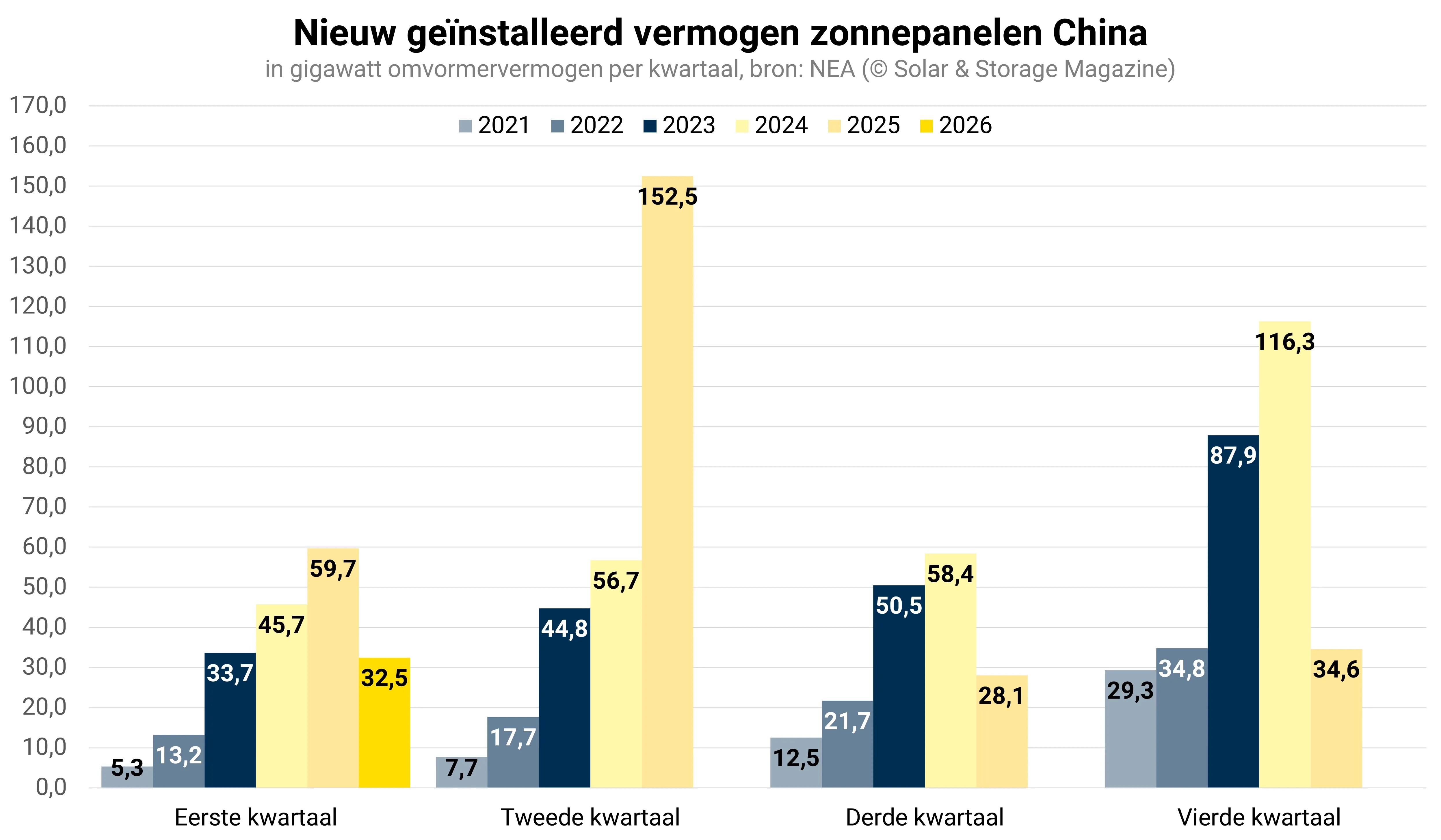 De daling heeft vooral te maken met de overgang van vaste tarieven naar marktprijzen die in juni 2025 inging. Tot die datum konden ontwikkelaars nog gebruikmaken van feed-in-tarieven, een systeem waarbij producenten een vast bedrag per kilowattuur ontvingen. Die zekerheid leidde tot een ongekende installatiehausse in mei 2025, toen in slechts 1 maand tijd meer dan 92 gigawatt werd aangesloten.
