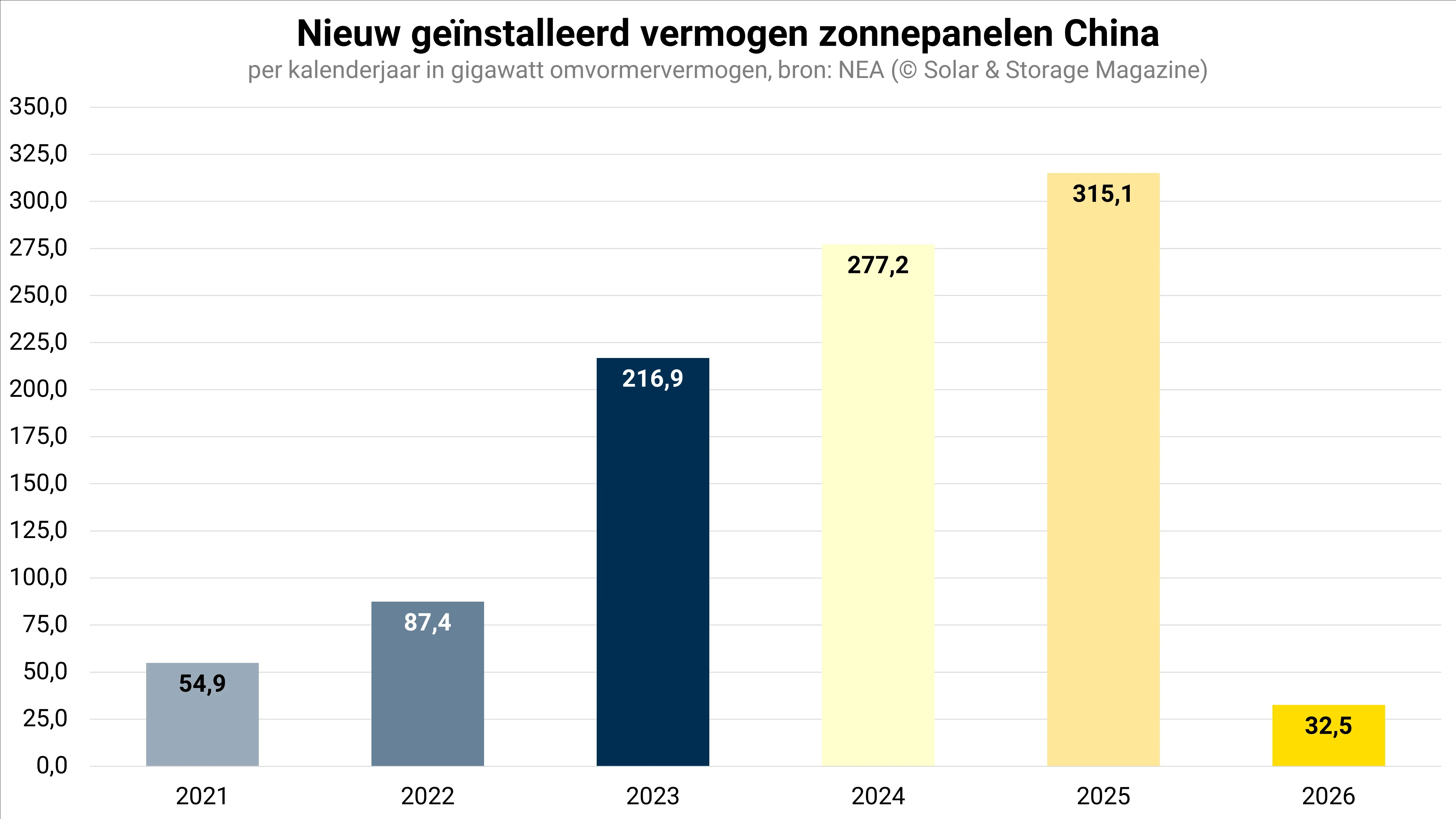 De China Photovoltaic Industry Association (CPIA) verwacht dat de jaarlijkse installaties in 2026 met 24 tot 43 procent zullen dalen ten opzichte van 2025. Het zou de eerste jaarlijkse daling in meer dan 7 jaar tijd zijn. De brancheorganisatie rekent op een totaal tussen de 180 en 240 gigawatt omvormervermogen. BloombergNEF voorspelde in december dat China dit jaar 273 gigawatt zou installeren.