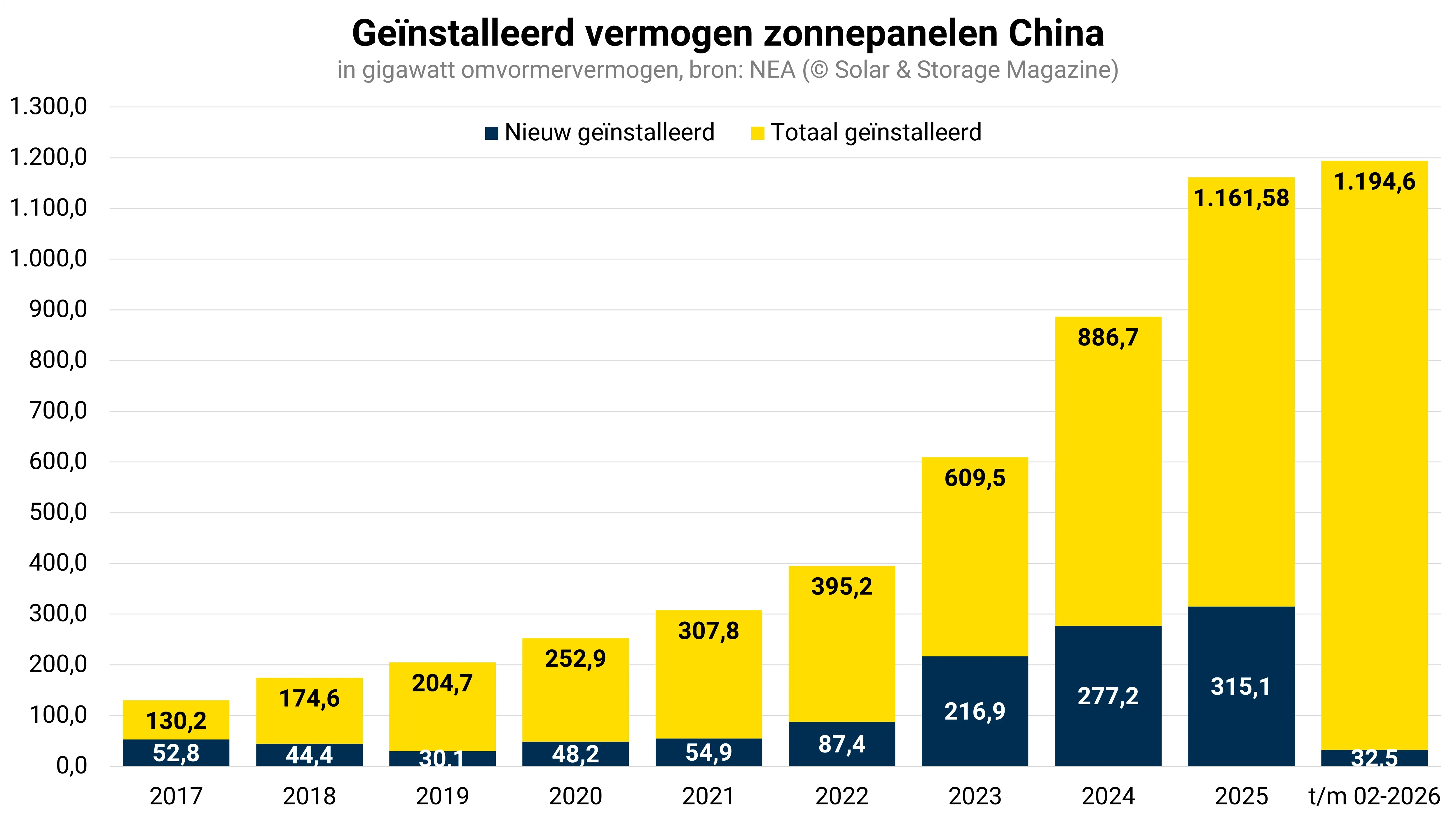 De terugval was verwacht na het recordjaar 2025. De cijfers van de Chinese National Energy Administration (NEA) laten zien dat het land in januari en februari 2025 nog 39,47 gigawatt omvormervermogen installeerde. Het niveau uit begin 2026 ligt zelfs onder de 36,72 gigawatt die in de eerste 2 maanden van 2024 werd gerealiseerd.