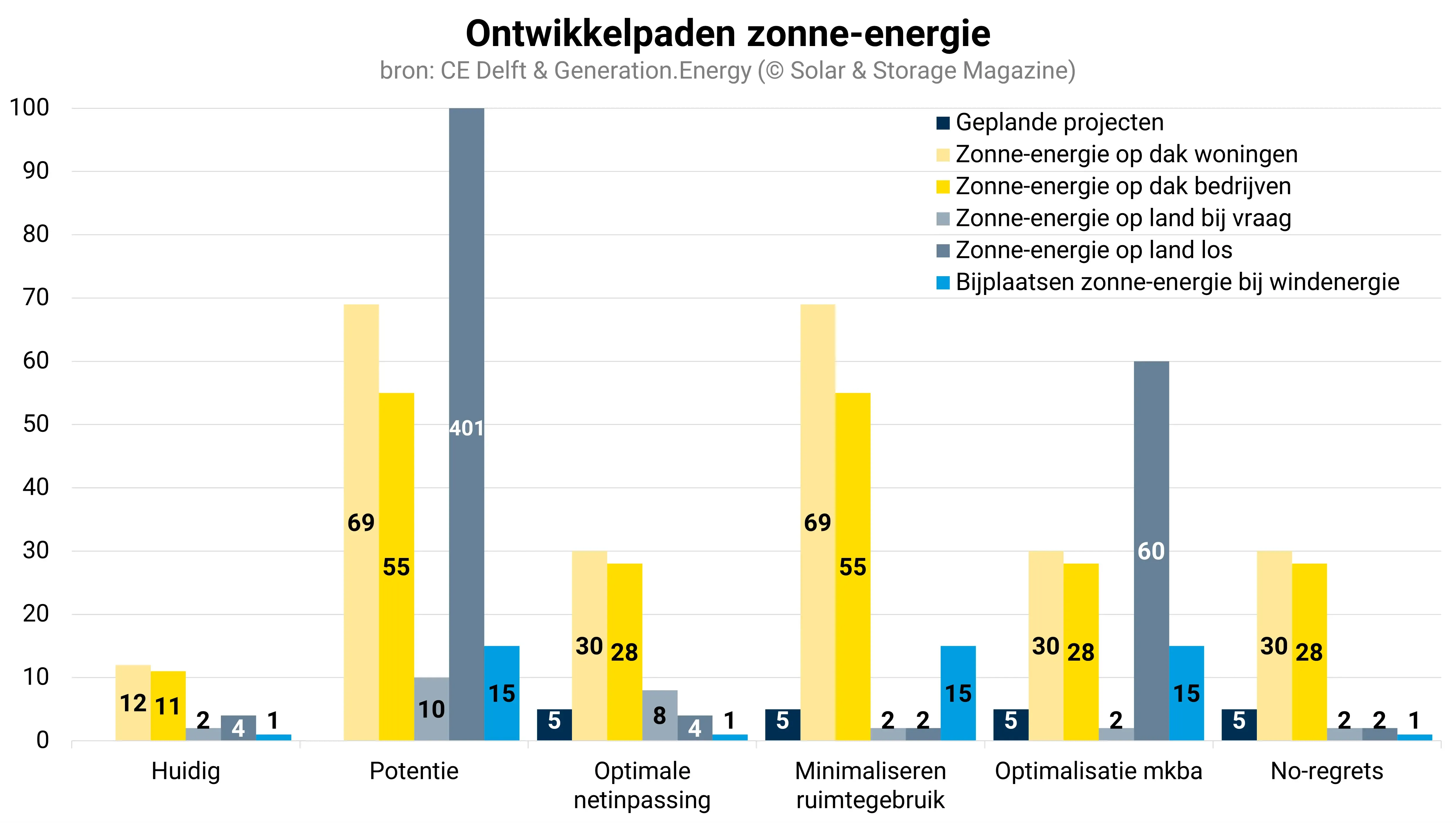 CE Delft houdt in zijn scenario’s voor zonne-energie rekening met minimaal 57 gigawattpiek en maximaal 127 gigawattpiek opgesteld vermogen in 2040. De energietransitie is echter niet afgerond in 2040. Richting 2050 zal de vraag naar elektriciteit en ook de benodigde hoeveelheid hernieuwbare opwek nog verder toenemen. Voor zonne-energie wordt in de verschillende scenario’s voor 2050 77 tot 175 gigawattpiek voorzien.