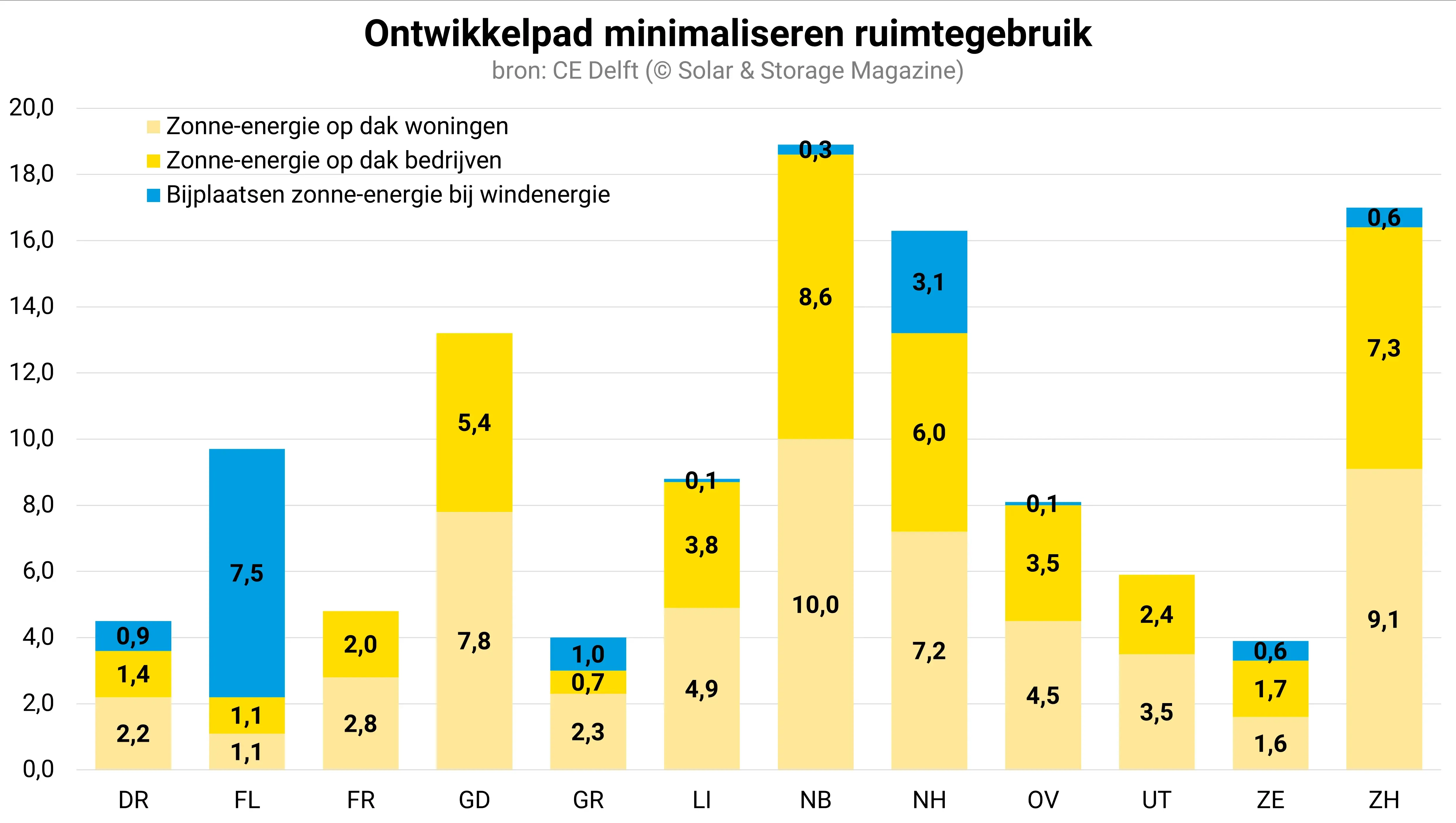 Bij het ontwikkelpad ‘Minimaliseren ruimtegebruik’ worden de meeste zonnepanelen gerealiseerd in de provincies met de meeste inwoners: Gelderland, Noord-Brabant, Noord-Holland en Zuid-Holland.