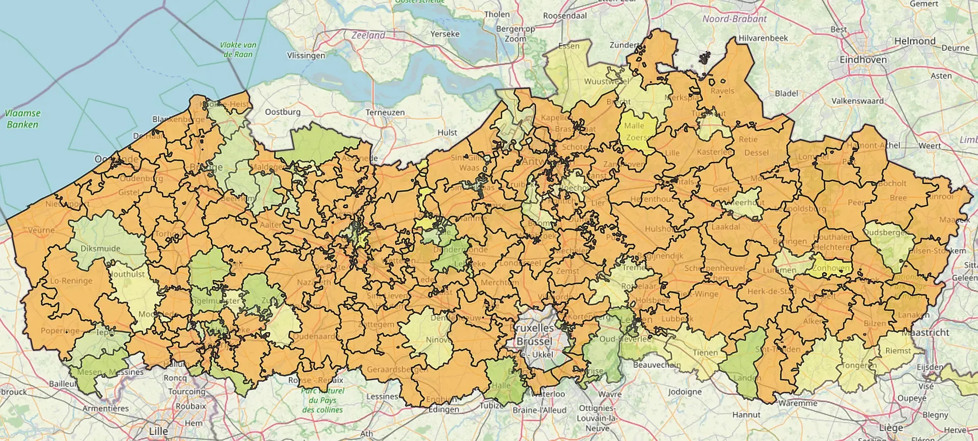 Groen: gewone aansluitingen mogelijk voor elk vermogen boven 5 megavoltampère. Lichtgroen: gewone aansluitingen mogelijk tot maximaal 5 megavoltampère. De impact op het bovenliggende elektriciteitsnet is nog onduidelijk. Geel: gewone aansluitingen mogelijk tot maximaal 5 megavoltampère. Voor grotere aansluitingen vanaf 1 megavoltampère extra afnamevermogen is flexibiliteit verplicht. De mate van flexibiliteit hangt af van de verwachte netcongestie in het gebied. Lichtgeel: gewone aansluitingen mogelijk boven 5 megavoltampère. Voor grotere aansluitingen vanaf 1 megavoltampère extra afnamevermogenis flexibiliteit verplicht. De mate van flexibiliteit hangt af van de verwachte netcongestie in het gebied. Oranje: alleen flexibele aansluitingen mogelijk. De mate van flexibiliteit hangt af van de verwachte netcongestie in het gebied. |