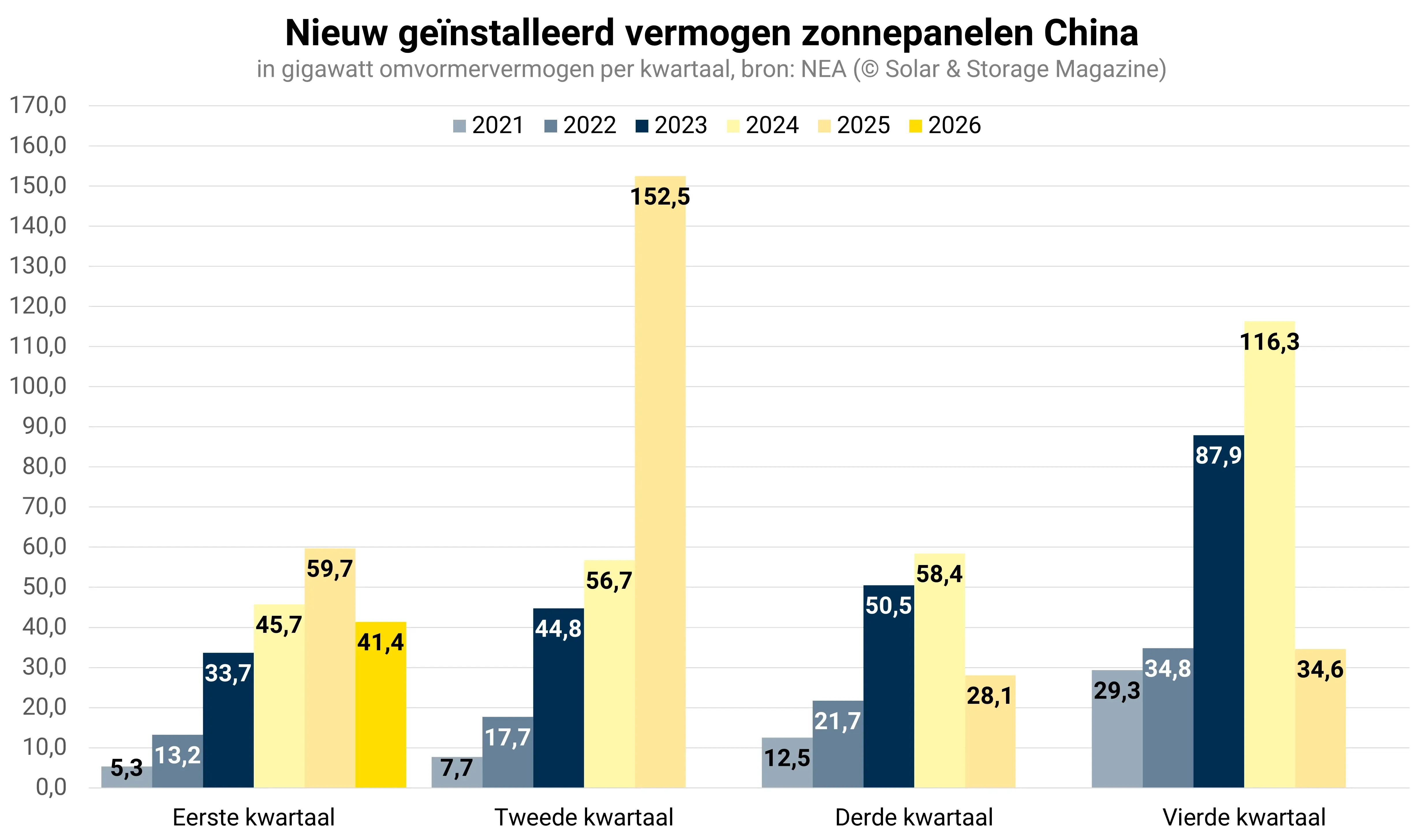Het is volgens de National Energy Administration (NEA) de eerste keer in 5 jaar tijd dat de kwartaalcijfers voor zonne-energie in China dalen. Vorig jaar breidde het land zijn capaciteit uit met een record van 315,07 gigawatt omvormervermogen. Die hausse kwam door de haast om projecten voor 1 juni 2025 aan te sluiten, de datum waarop het land overstak op een marktsysteem met veilingen in plaats van vaste tarieven.