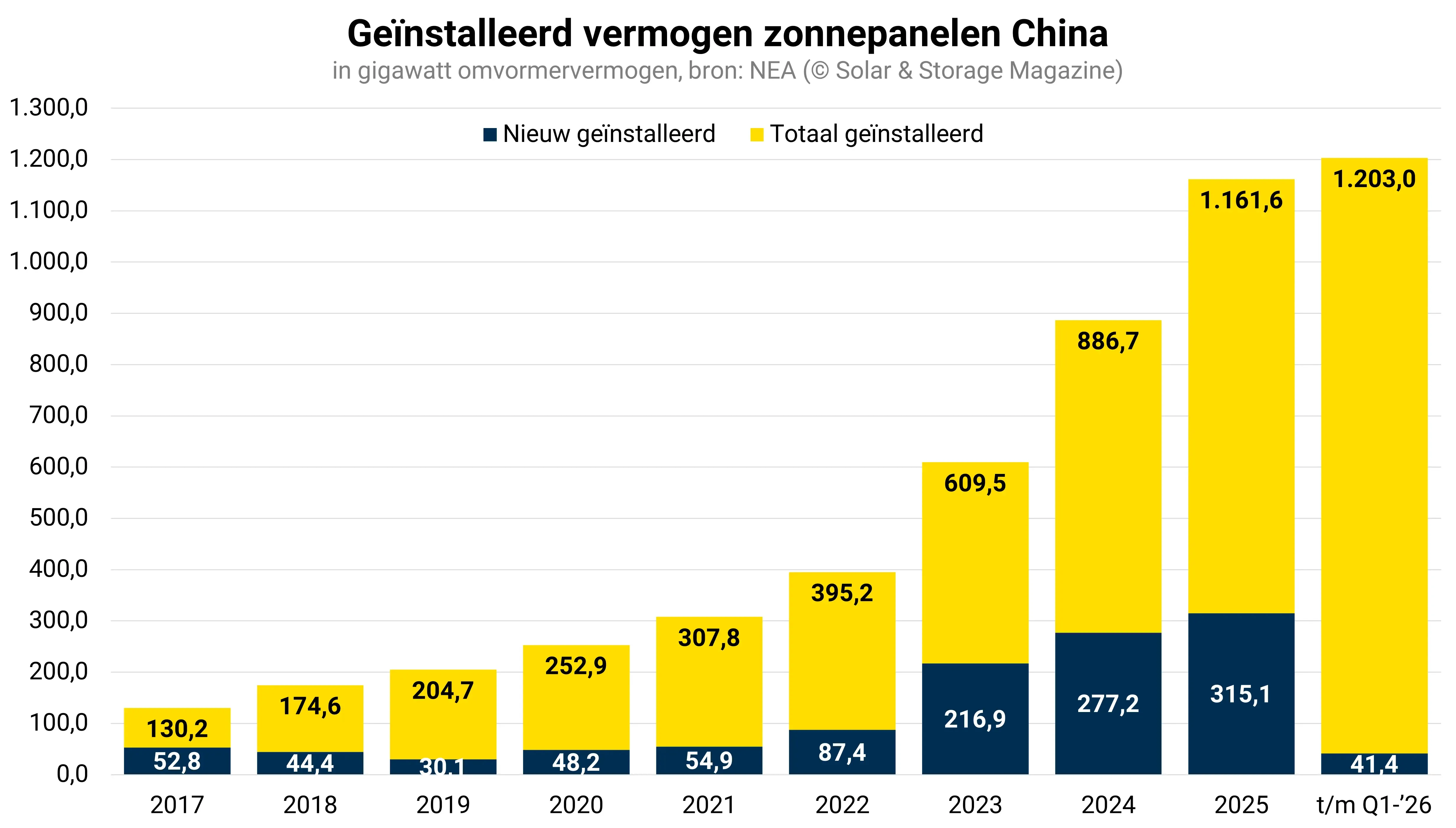 In het eerste kwartaal van 2026 werd wel meer zonne-energievermogen verwelkomd dan in het eerste kwartaal van 2023 en zo’n 9 procent minder dan in het eerste kwartaal van 2024.