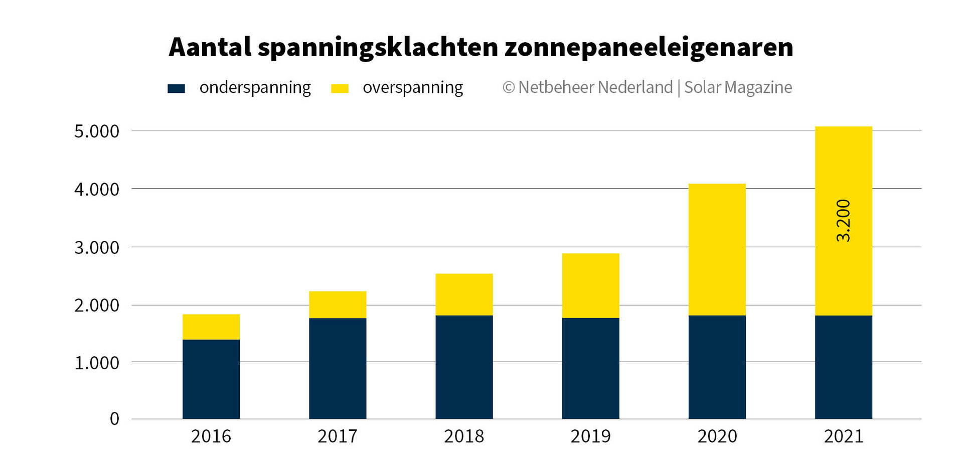 Belangrijke kanttekening bij de gemelde aantallen is dat het om een schatting gaat. In de praktijk hebben de netbeheerders in 2021 namelijk slechts 3.200 klachten over spanningsproblemen ontvangen, zoals blijkt uit onderstaande grafiek. Wel is het aantal klachten afgelopen jaar met 45 procent gegroeid.