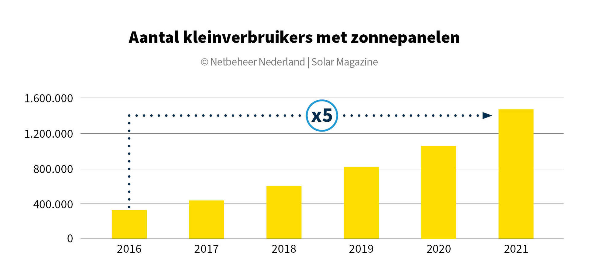 In onderstaande grafiek met data van Netbeheer Nederland is te zien dat het aantal kleinverbruikers met zonnepanelen sinds 2016 vervijfvoudigd is.