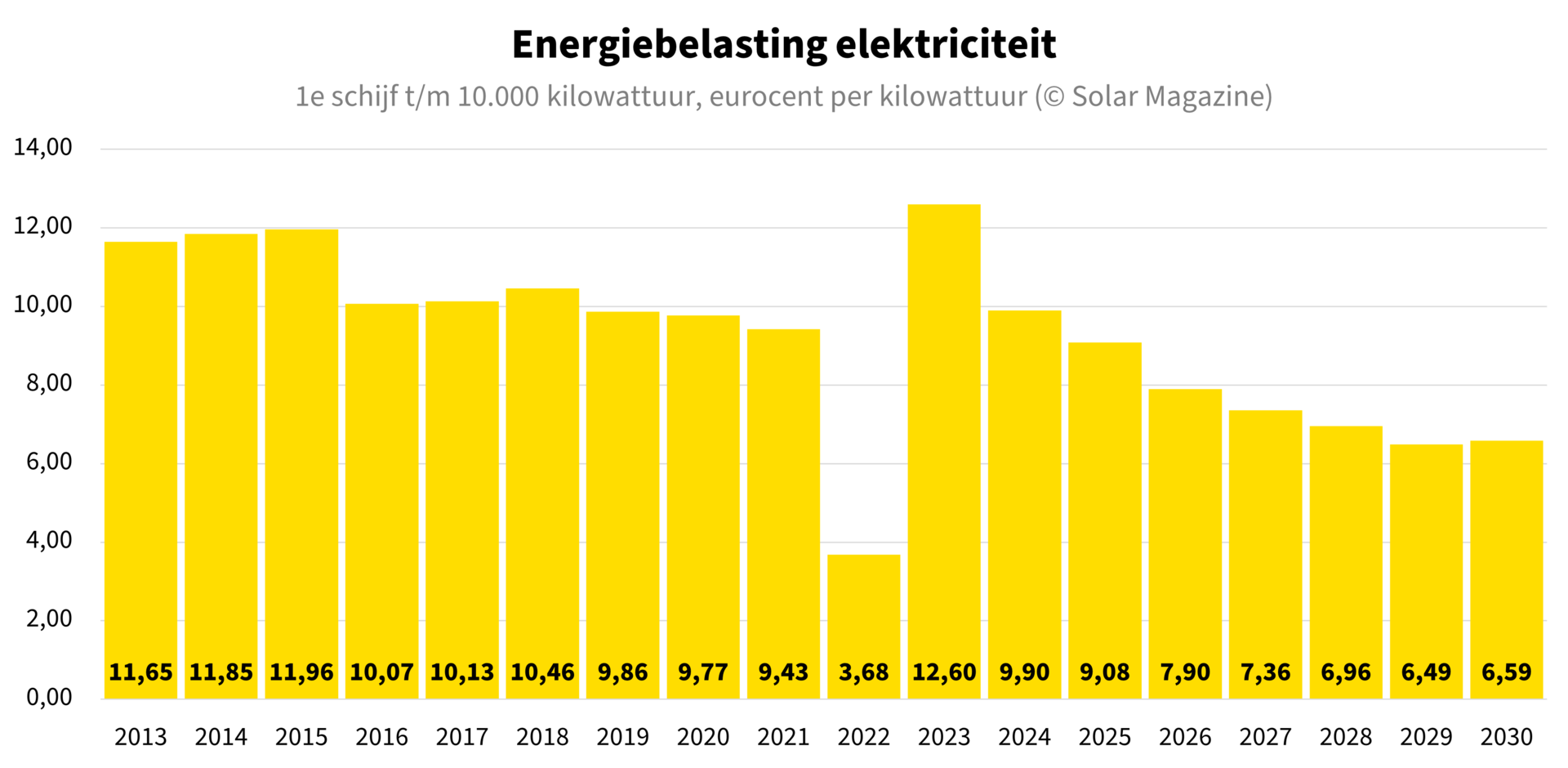 Vorig jaar besloot de Nederlandse regering voor het eerst om de energierekening te compenseren en wel door de energiebelasting op elektriciteit in 2022 fors te verlagen naar 3,679 eurocent per kilowattuur in de eerste schijf tot en met 10.000 kilowattuur. Dat benadeelde eigenaren van zonnepanelen die de terugverdientijd met gemiddeld 6 maanden zagen oplopen. Ook voor 2023 zou een verlaagde energiebelasting van toepassing zijn van 5,094 eurocent per kilowattuur. Daarbij meldde de regering in de op Prinsjesdag gepresenteerde Miljoenennota wel al dat die enkel van toepassing zou zijn als het prijsplafond niet zou doorgaan. Omdat het prijsplafond er definitief gaat komen, wordt de 5.422 miljoen euro die gereserveerd was voor de energiebelastingverlaging gebruikt voor de financiering van het prijsplafond. Direct gevolg is dat de energiebelasting in de eerste schijf naar het hoogste niveau in meer dan 10 jaar tijd gaat: 12,60 eurocent per kilowattuur.